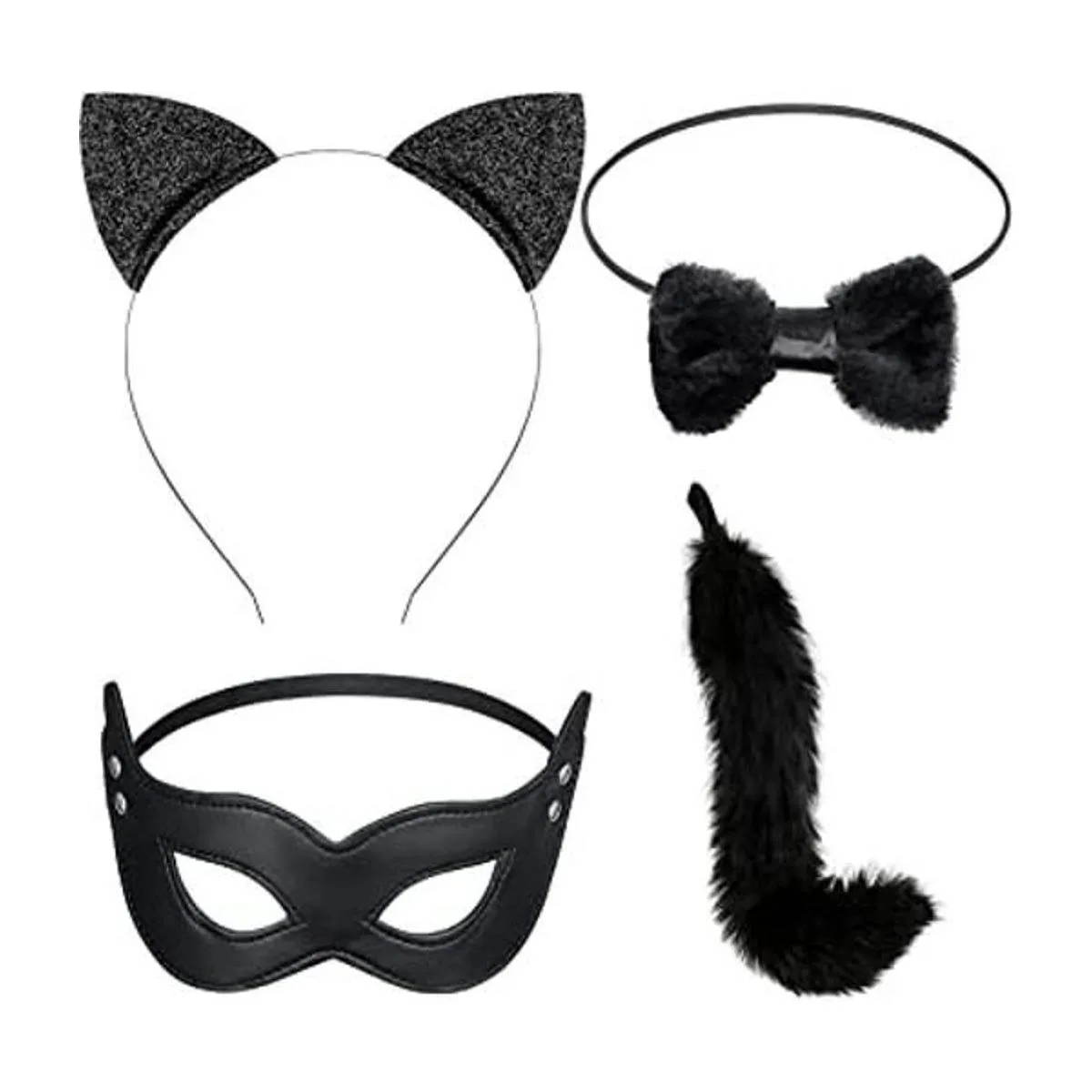 Juego de disfraz de gato de 4 piezas, juego de disfraz de cola de gato de pelo largo, disfraz de Halloween, diadema de orejas de gato, lazo de gato, máscara de arlequín para el día de San Valentín, disfraz de Halloween