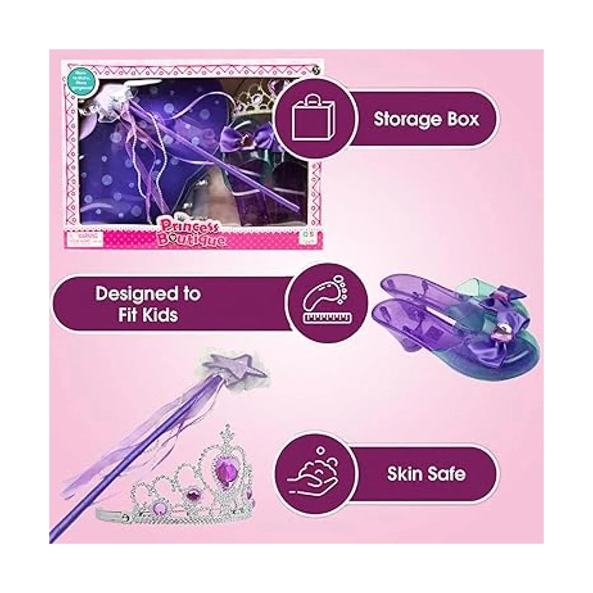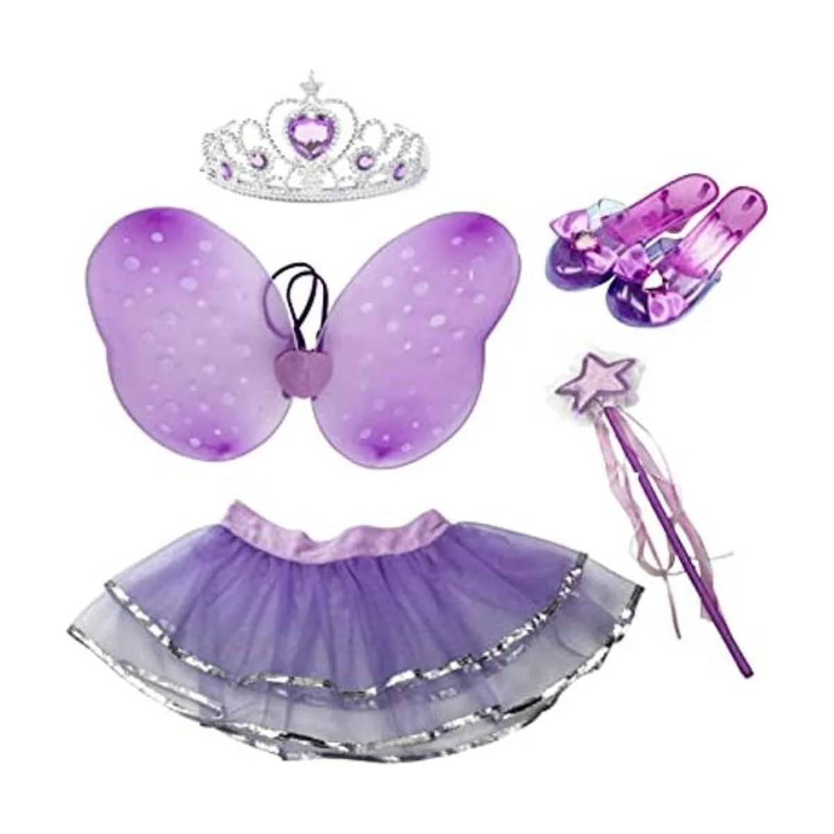 Incluye alas, falda, varita de princesa, tiara y zapatos