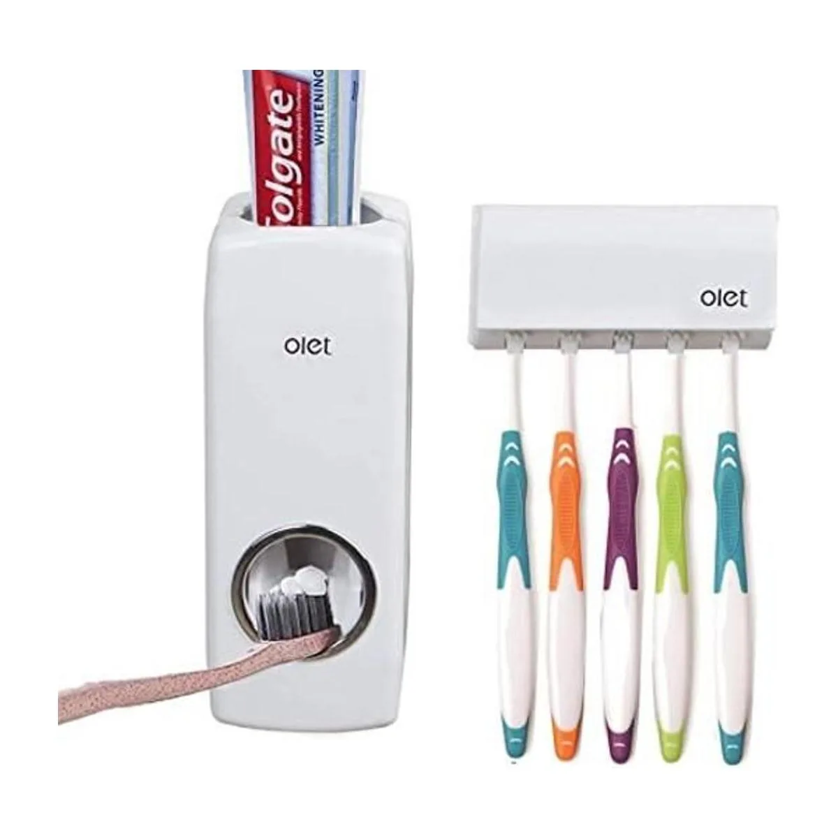 Juego de dispensador de pasta de dientes y soporte para cepillo de dientes, exprimidor automático de pasta de dientes y organizador de cepillo de dientes, accesorios de baño de baño 5 ranuras para cepillos, color blanco