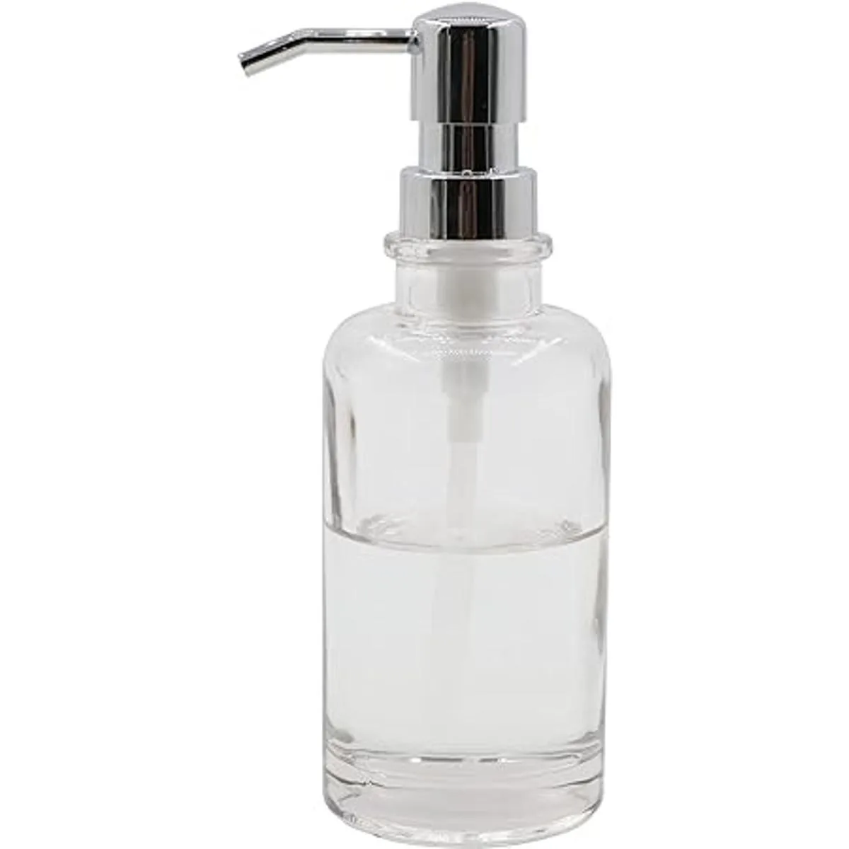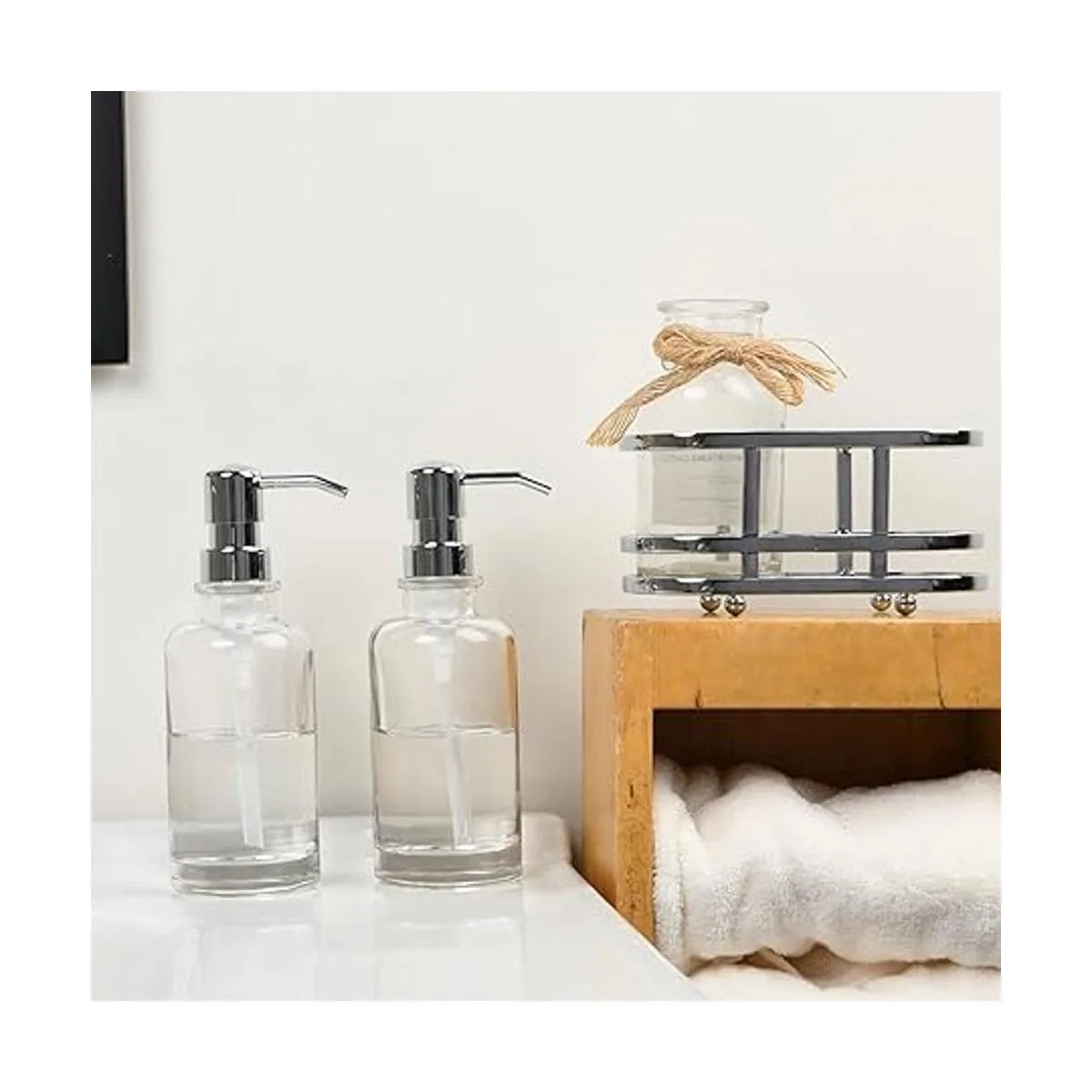 Juego de dispensador redondo de 3 piezas de loción de jabón de vidrio pesado con organizador de metal para el hogar, baño, cocina, viajes, oficina, bandeja de metal hecha a mano
