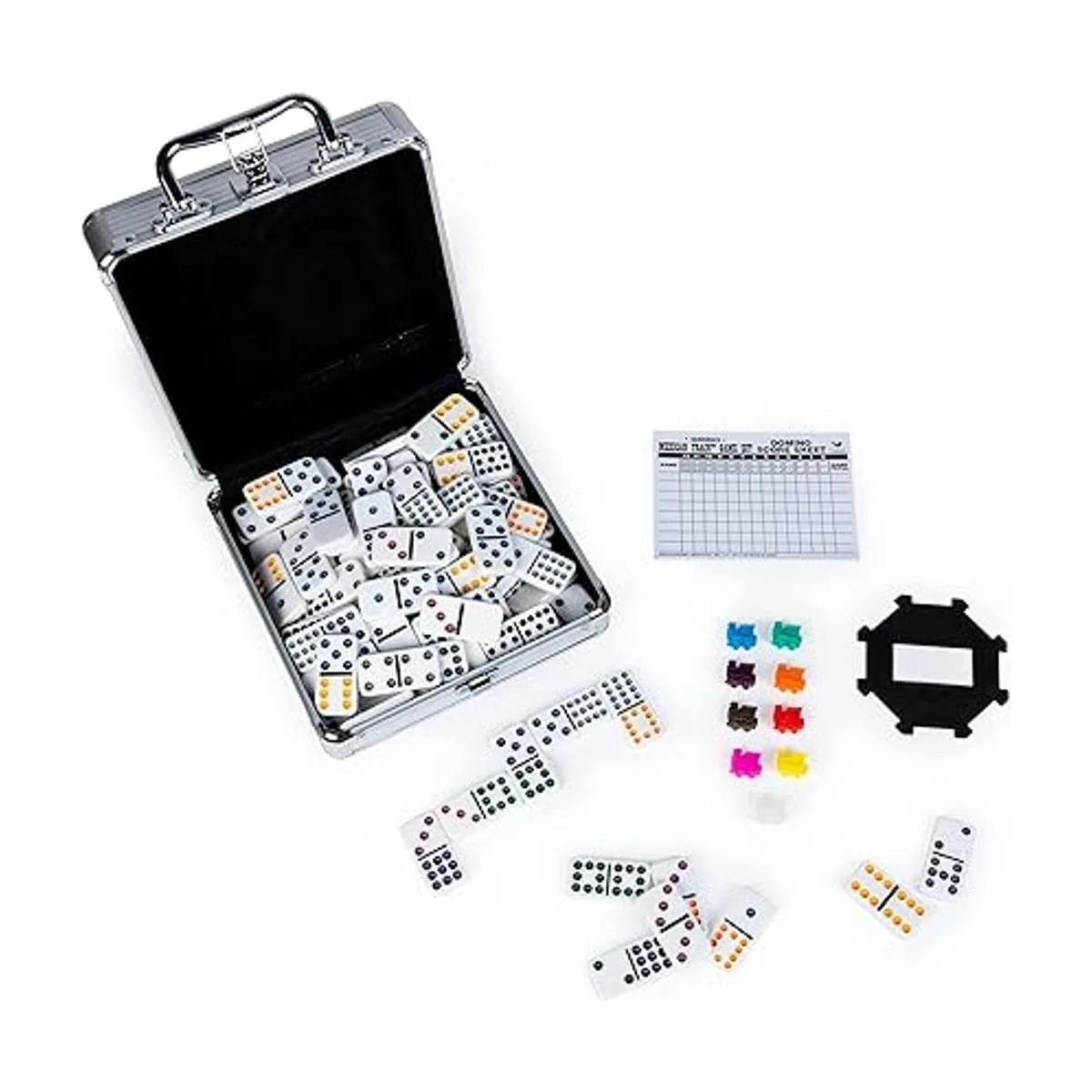 El juego incluye pieza básica de arranque, doble 12 puntos de color dominados, nueve marcadores, almohadilla de puntuación.