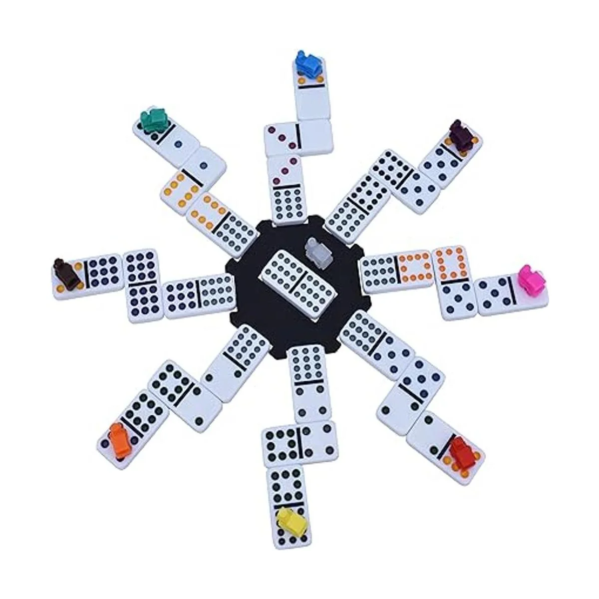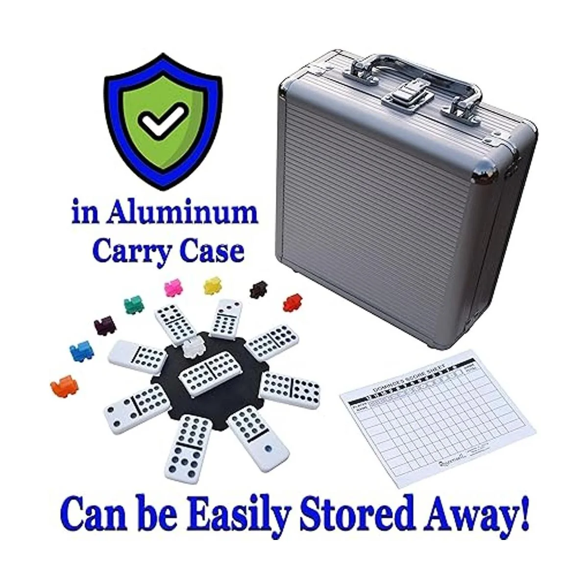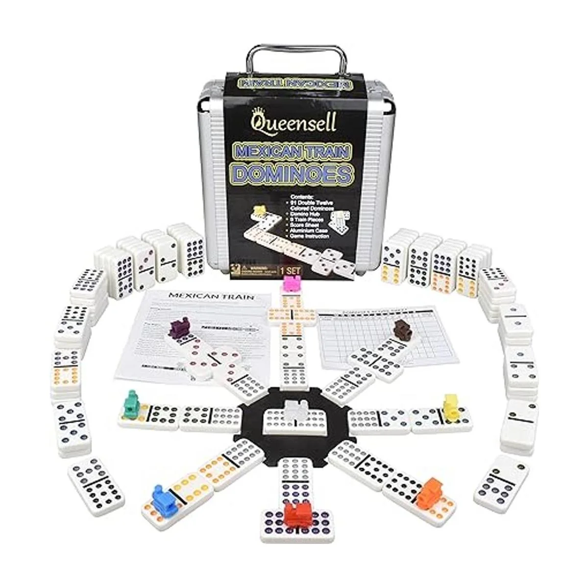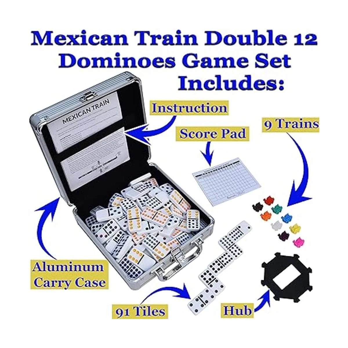Juego todo en uno: el juego de dominó de tren mexicano viene con todo lo que necesitas para pasar un buen rato con familiares y amigos, incluyendo 91 azulejos dobles clásicos, 9 trenes de plástico y un cubo de plástico en una funda de transporte de aluminio reutilizable para asegurarte de que tienes suficiente para jugar con hasta 29 jugadores