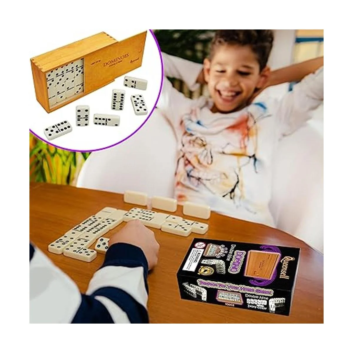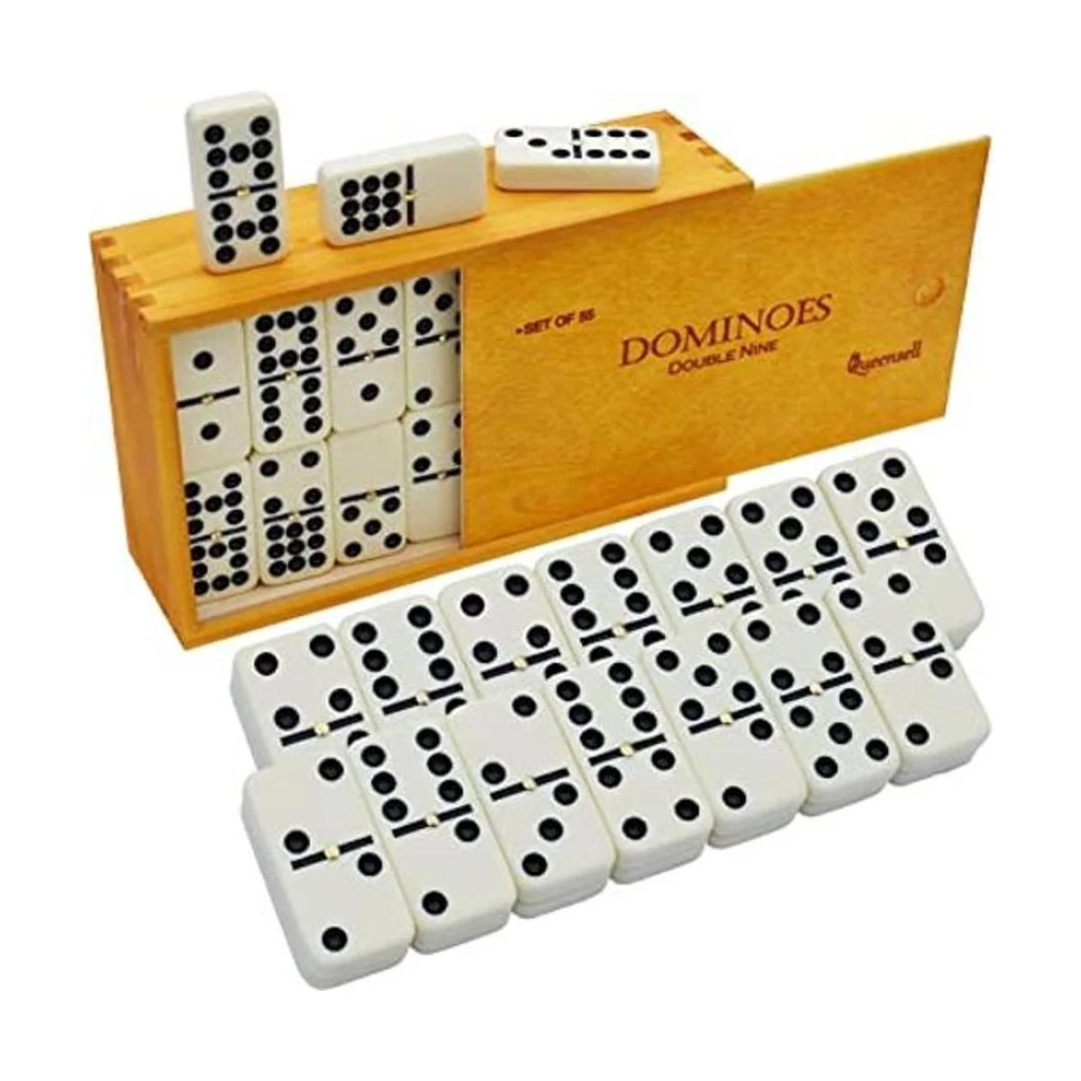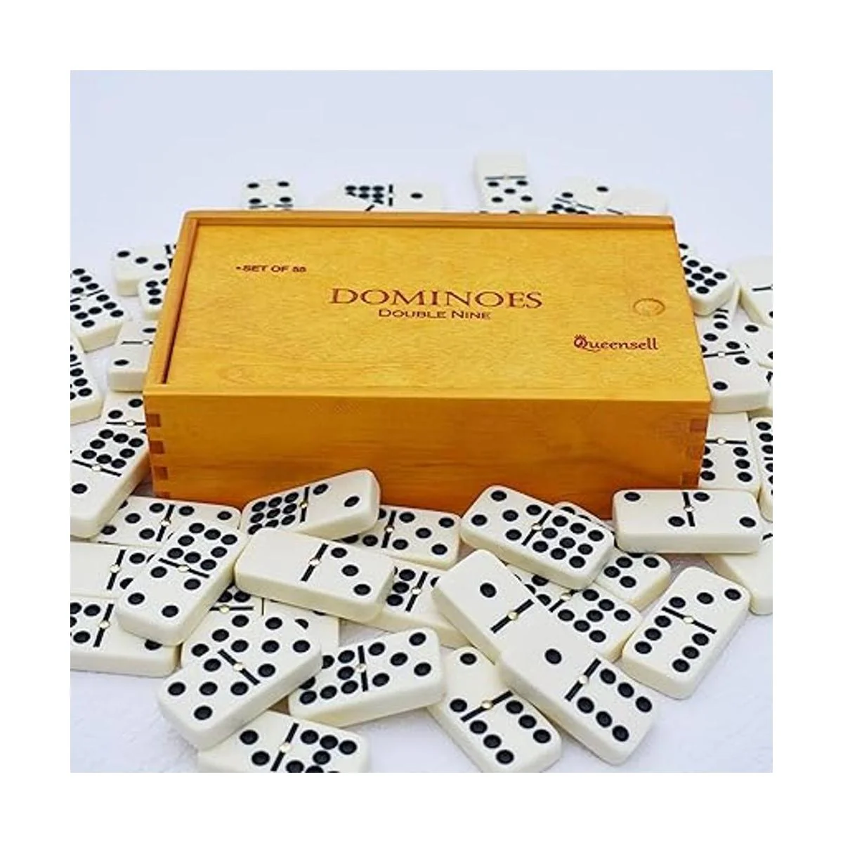 Valor: el juego de dominó para adultos incluye 55 fichas de dominó clásicas de color marfil negro con puntos giratorios y caja de madera marrón. El juego de dominó dobles de 9 está numerado en un sistema estándar, marcado en blanco o con 19 puntos empotrados en ambos extremos, como es típico en un juego clásico de dominó