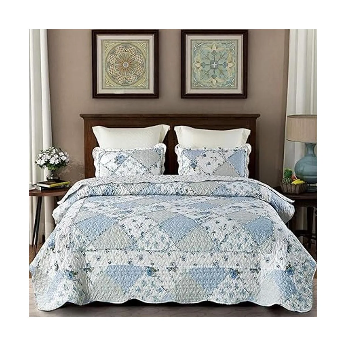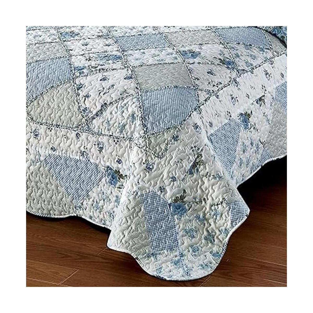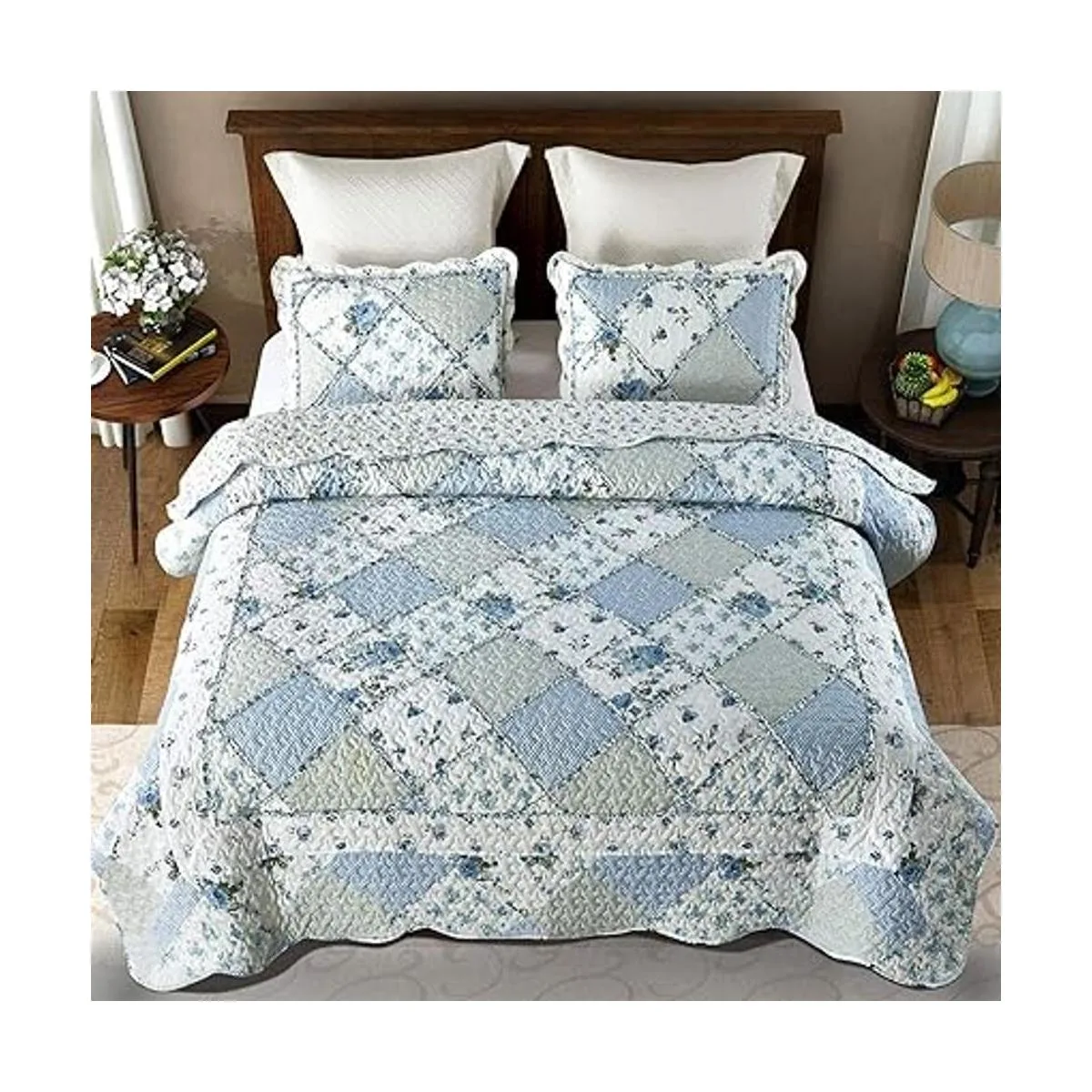 Juego de edredón de retazos azules, tamaño Queen, colcha acolchada de 3 piezas, edredón ligero floral, reversible, juego de ropa de cama con 2 fundas de almohada para todas las estaciones