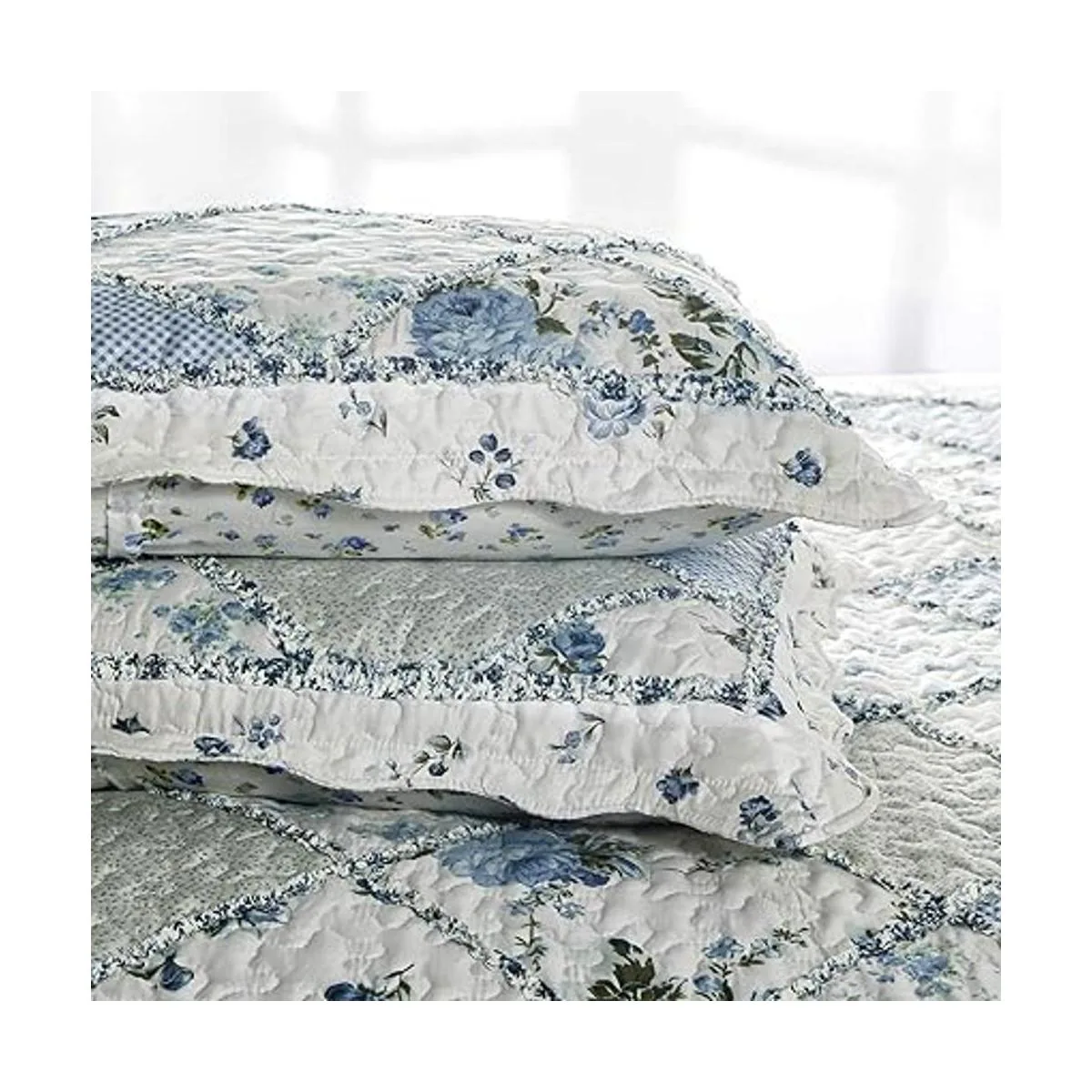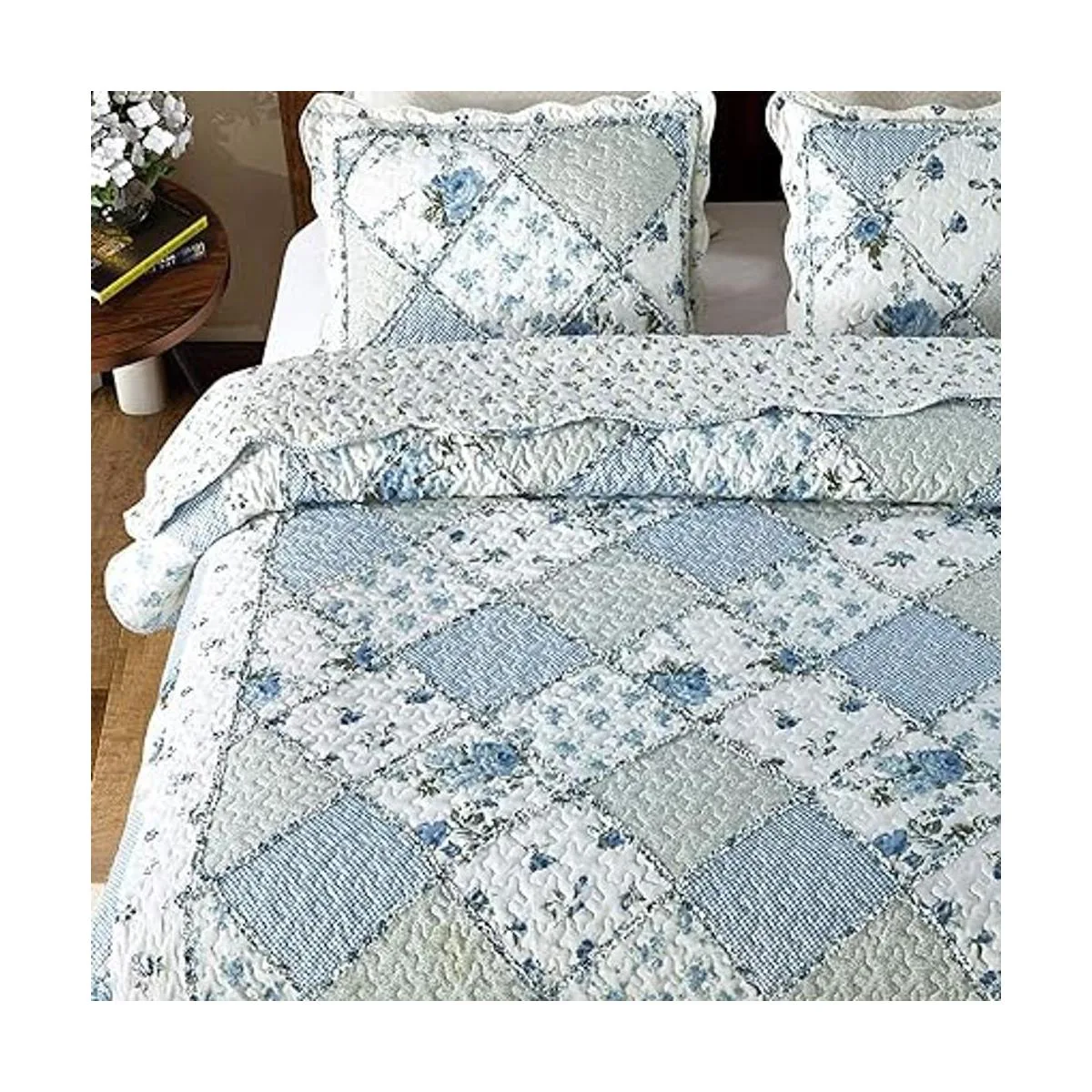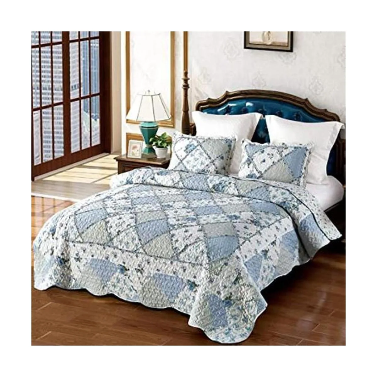Juego de edredón de retazos azules, tamaño Queen, colcha acolchada de 3 piezas, edredón ligero floral, reversible, juego de ropa de cama con 2 fundas de almohada para todas las estaciones