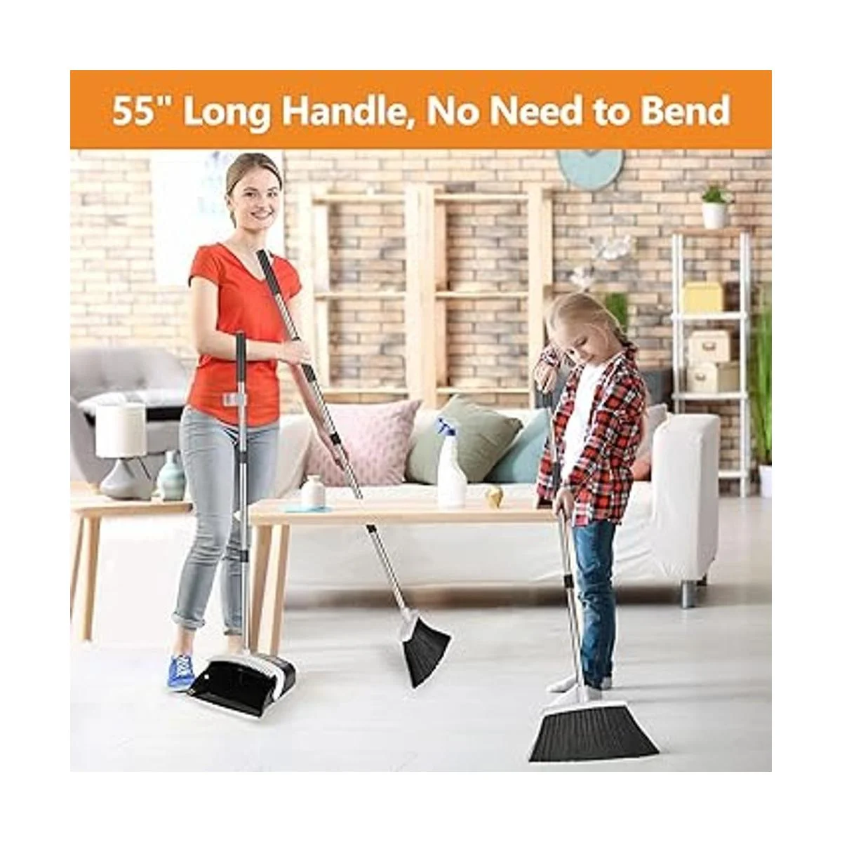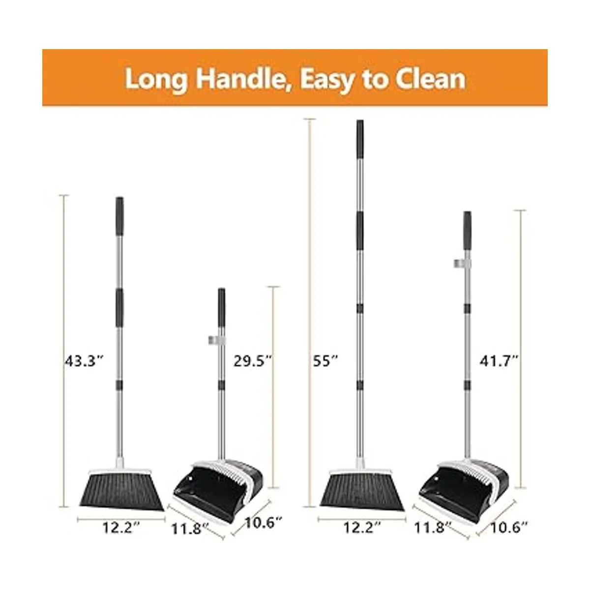 Sartén antipolvo de mango largo con combo de escoba: mango de escoba de 55 pulgadas de largo con recogedor de 41.7 pulgadas de mango largo, por lo que ya no necesitas agacharte para barrer. Escoba de ángulo doméstico de 12 pulgadas de ancho para una limpieza eficiente.