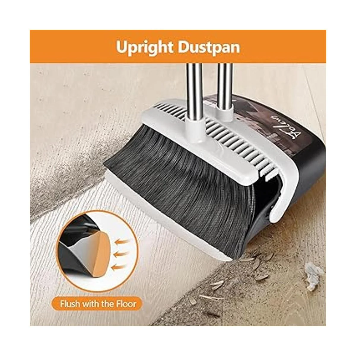 Juego de recogedor y escoba de pie: el recogedor se puede bloquear en un lugar vertical para estar de pie y vaciar fácilmente. También puedes colgar la escoba en el recogedor para que puedan mantenerse de pie juntas para un almacenamiento compacto.
