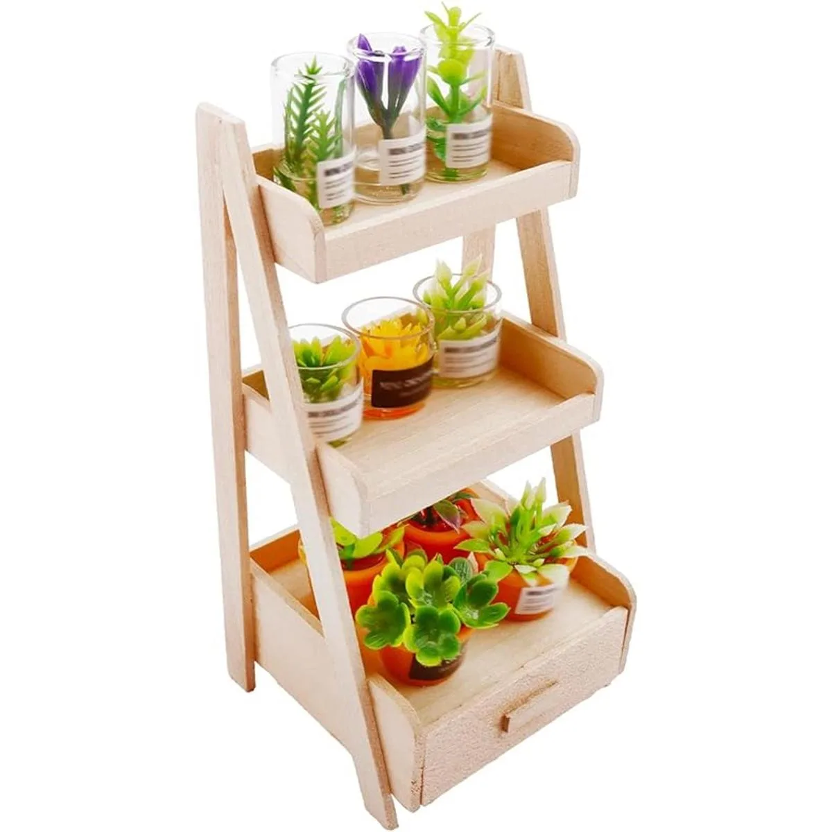 Juego de estantería de madera en miniatura de 11 piezas y mini plantas en maceta, muebles vintage de mini casa, kit de estante de plantas para decoración de casa en miniatura de jardín de hadas