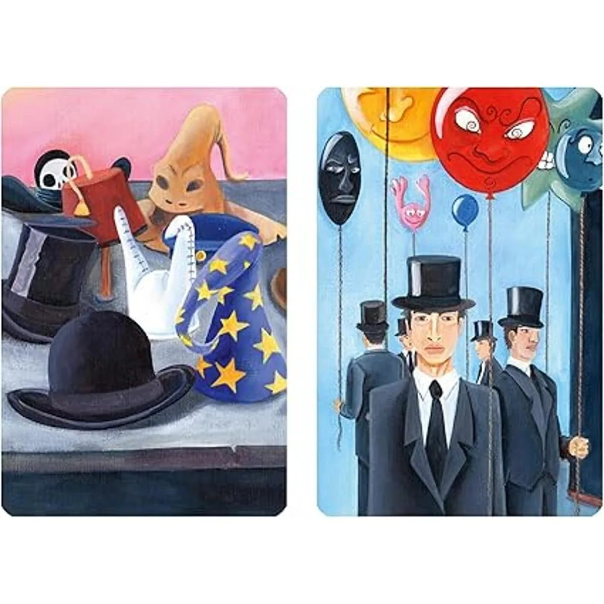 CREATIVE GUESSING GAME: Each round, one player selects a card and thinks up a clue inspired by the card. The other players all choose cards that they think match the clue. The cards are shuffled and then revealed. Players secretly vote for the card that best matches the narrators story. The player whose card is chosen scores points.