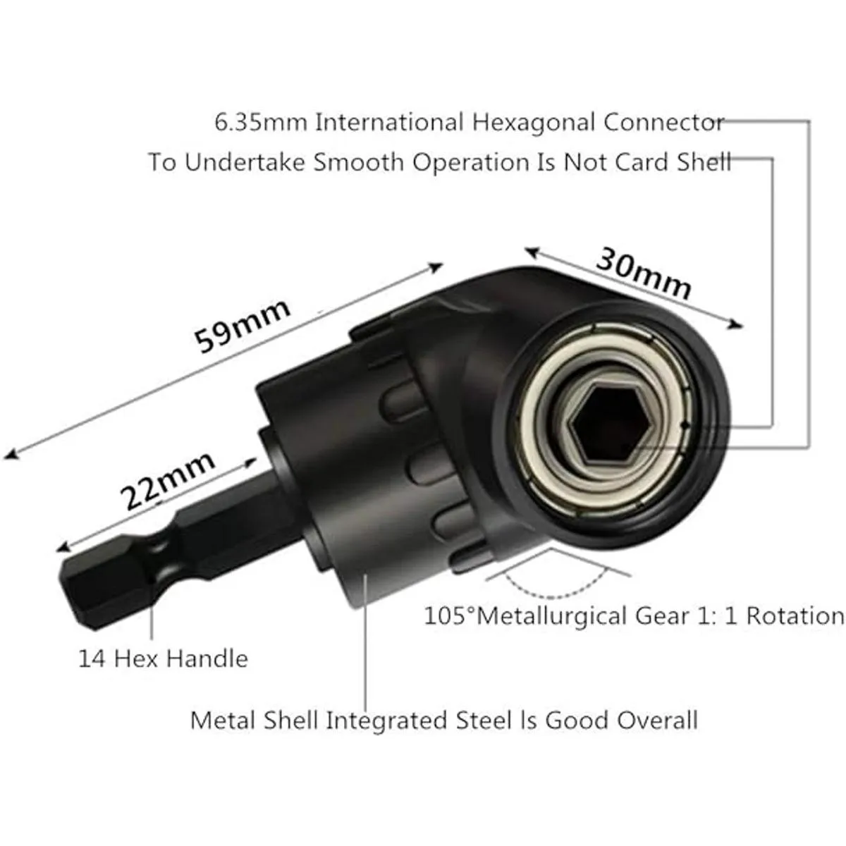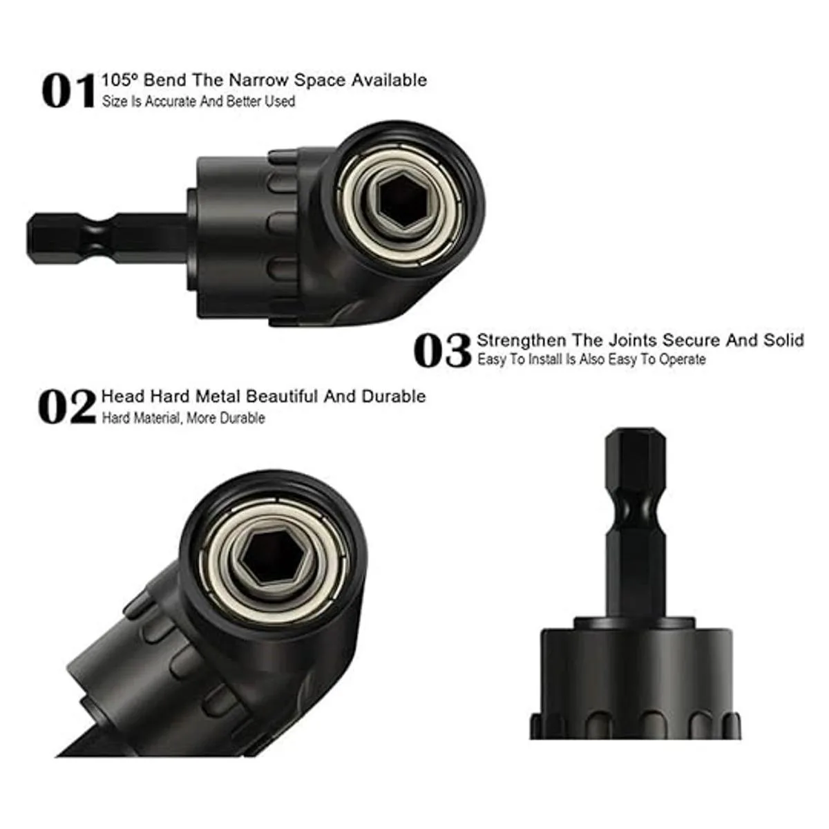 Alta calidad Extensión de ángulo de 105 hecha de acero al cromo vanadio, soporte de broca de ángulo de alta dureza, antioxidante, cuerpo fundido duradero con 3 rodamientos de bolas para una larga vida útil. Imán fuerte integrado para una buena potencia de sujeción, este accesorio de taladro de ángulo recto es fácil de usar y evita que se caiga. Fácil de usar Extensión de ángulo de 105 grados, ajuste paralelo de 360, herramienta práctica perfecta para esquinas de acceso y apretadas espacios, par máximo 1 5 n/m.