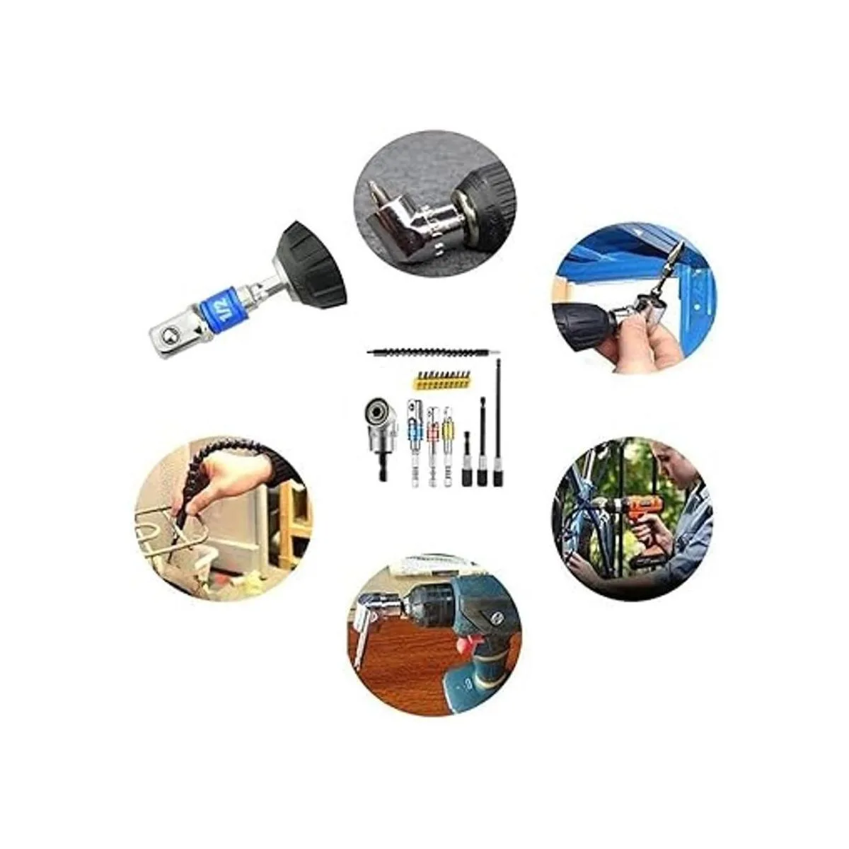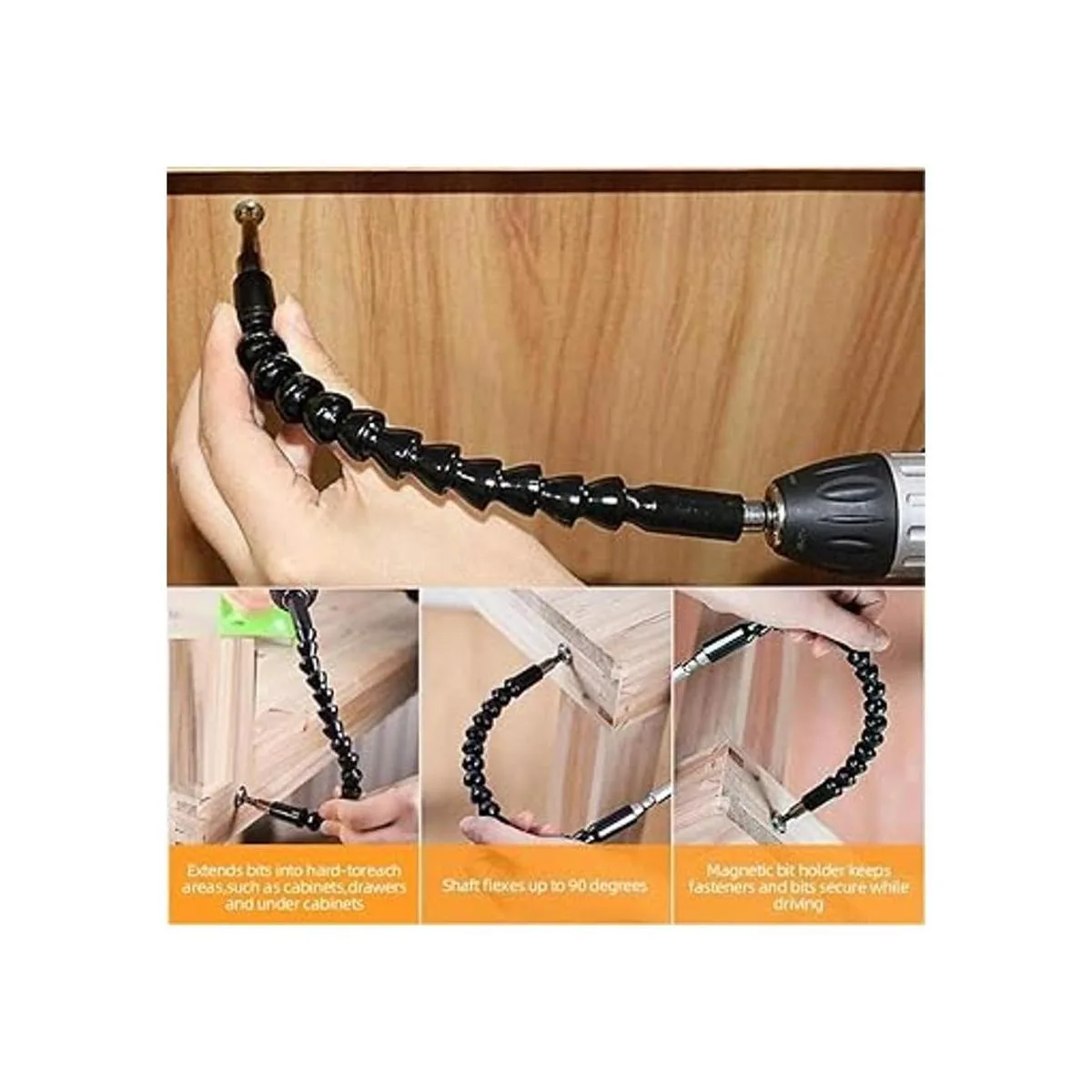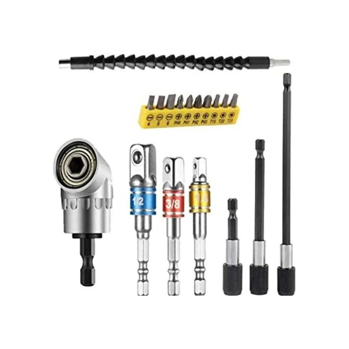 Colocación completa: el paquete incluye 1 extensión de broca flexible, 1 extensión de taladro de ángulo recto de 105, 3 adaptadores universales de 1/4 3/8 1/2 pulgadas, 3 soportes para brocas, 10 puntas de destornillador. Este kit de extensión funciona muy bien, cuando tienes acceso limitado.