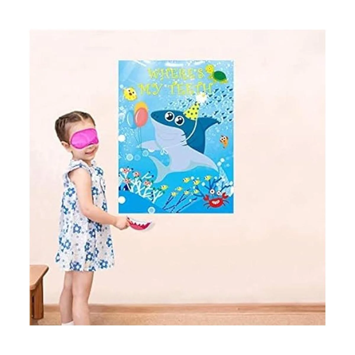 Cómo jugar: coloca el póster de tiburón en la pared o puerta con cinta la cinta no está incluida. Luego, mantén la calcomanía de dientes de tiburón cerca del póster después de usar la venda para los ojos. La persona a la que está más cerca es el ganador.
