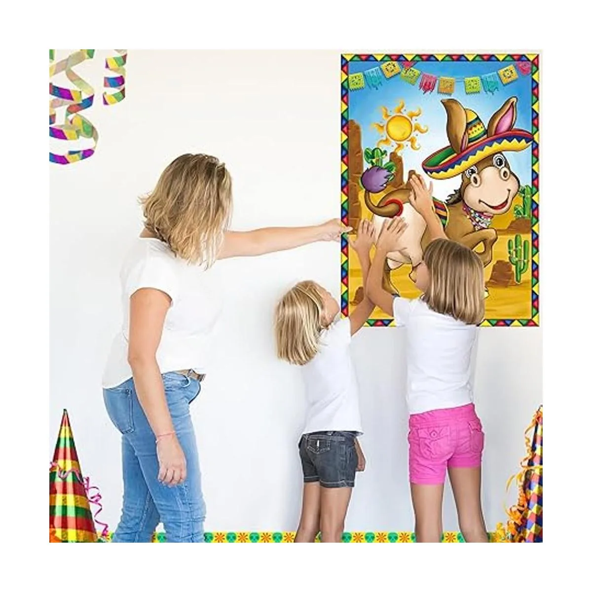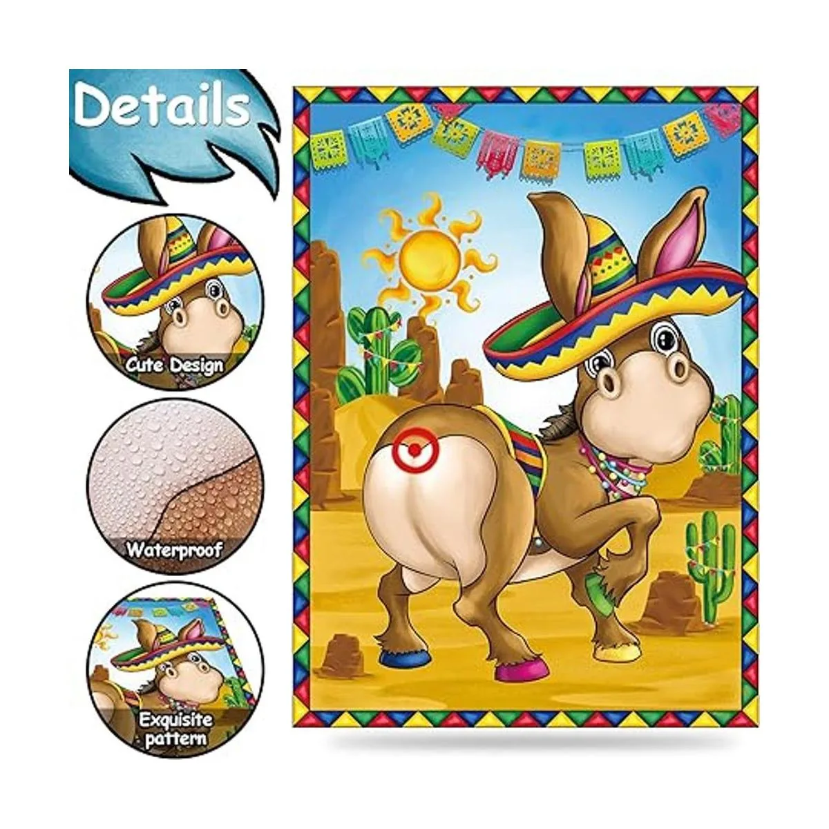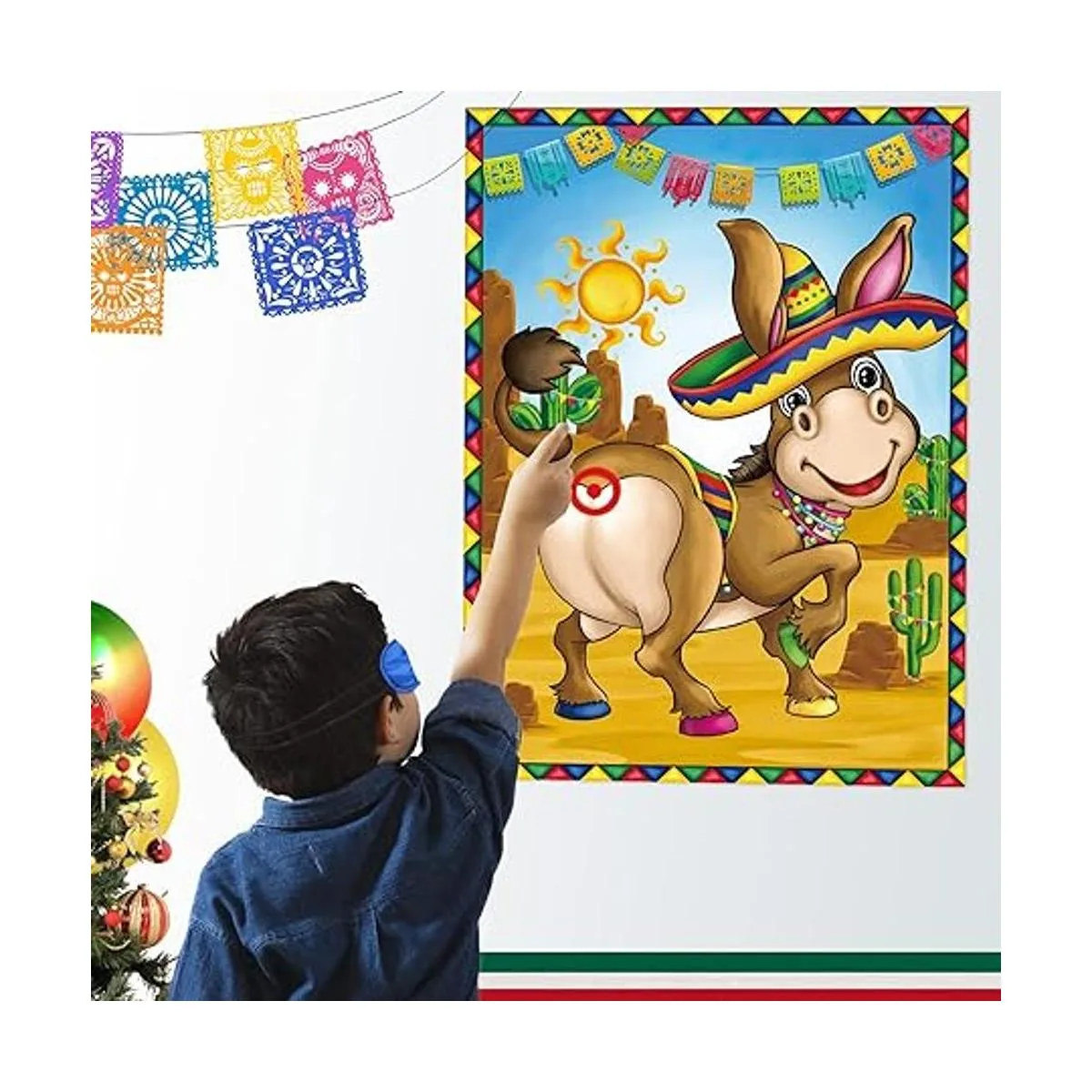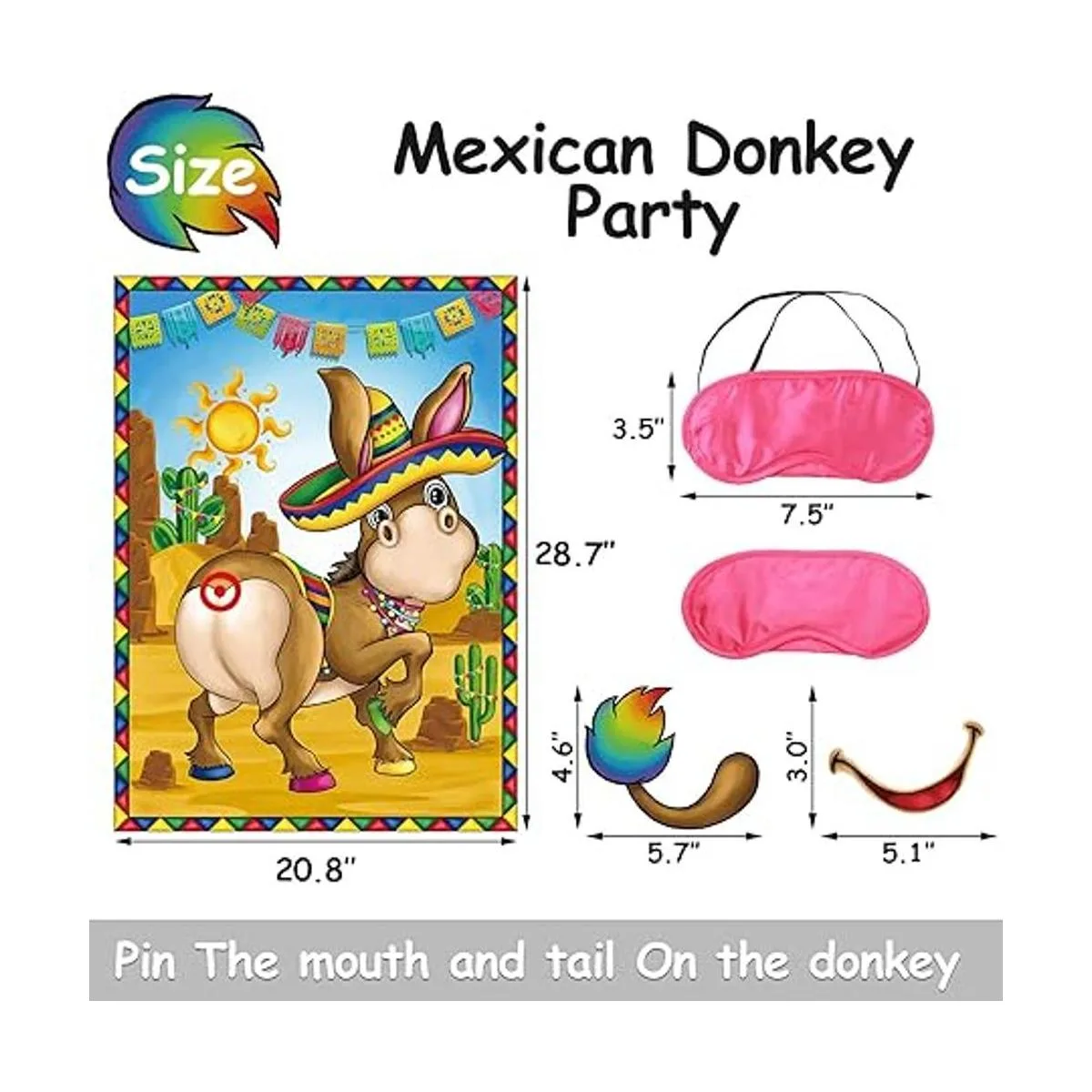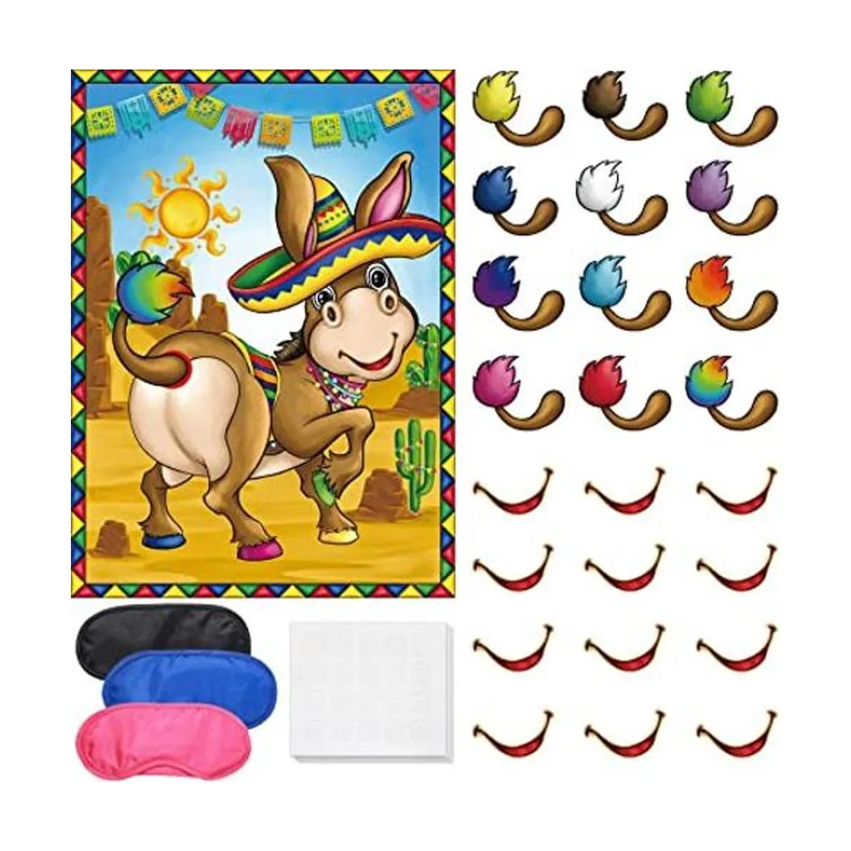 Juego de fiesta mexicana, pin la boca y la cola en el burro, juego de burro mexicano con los ojos y calcomanías para niños, fiesta mexicana, carnaval, suministros de decoración de fiesta de cumpleaños