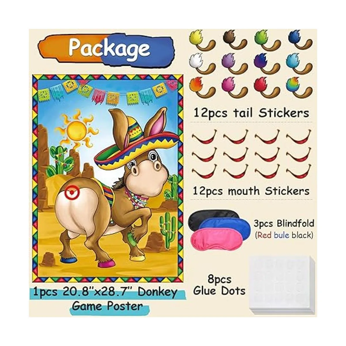 Bonita combinación de suministros de juego: recibirás 1 póster de juego de burro impermeable, 12 calcomanías reutilizables para la boca, 12 coloridas calcomanías reutilizables para colas, 3 coloridas máscaras de ojos y 8 cintas de doble cara, combinación de suministros de juego completo e ideal para dar a tu familia una fiesta mexicana memorable de carnaval