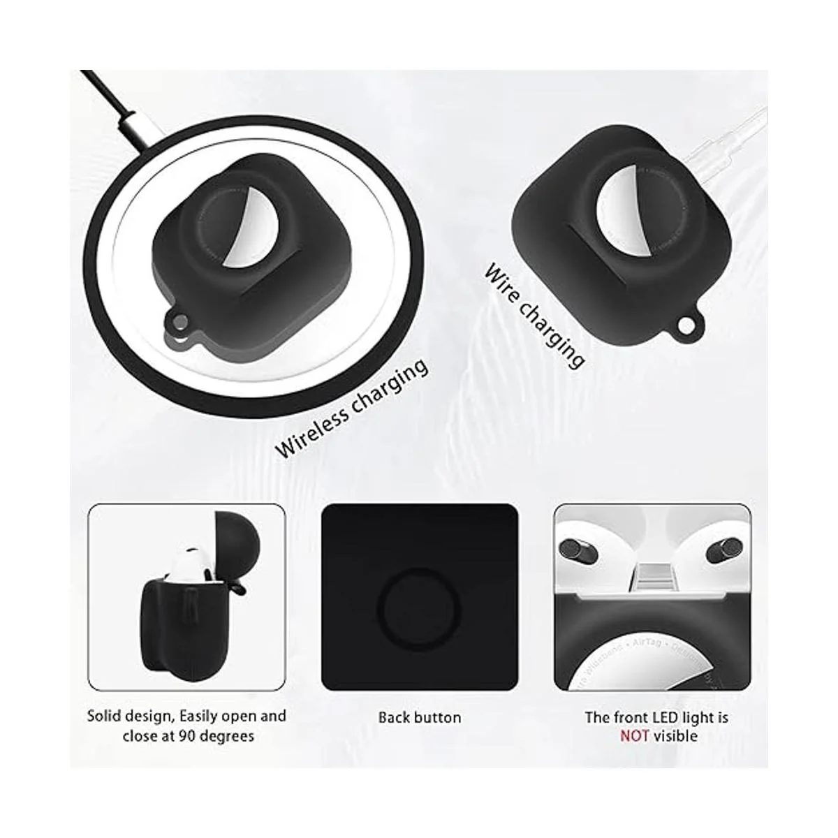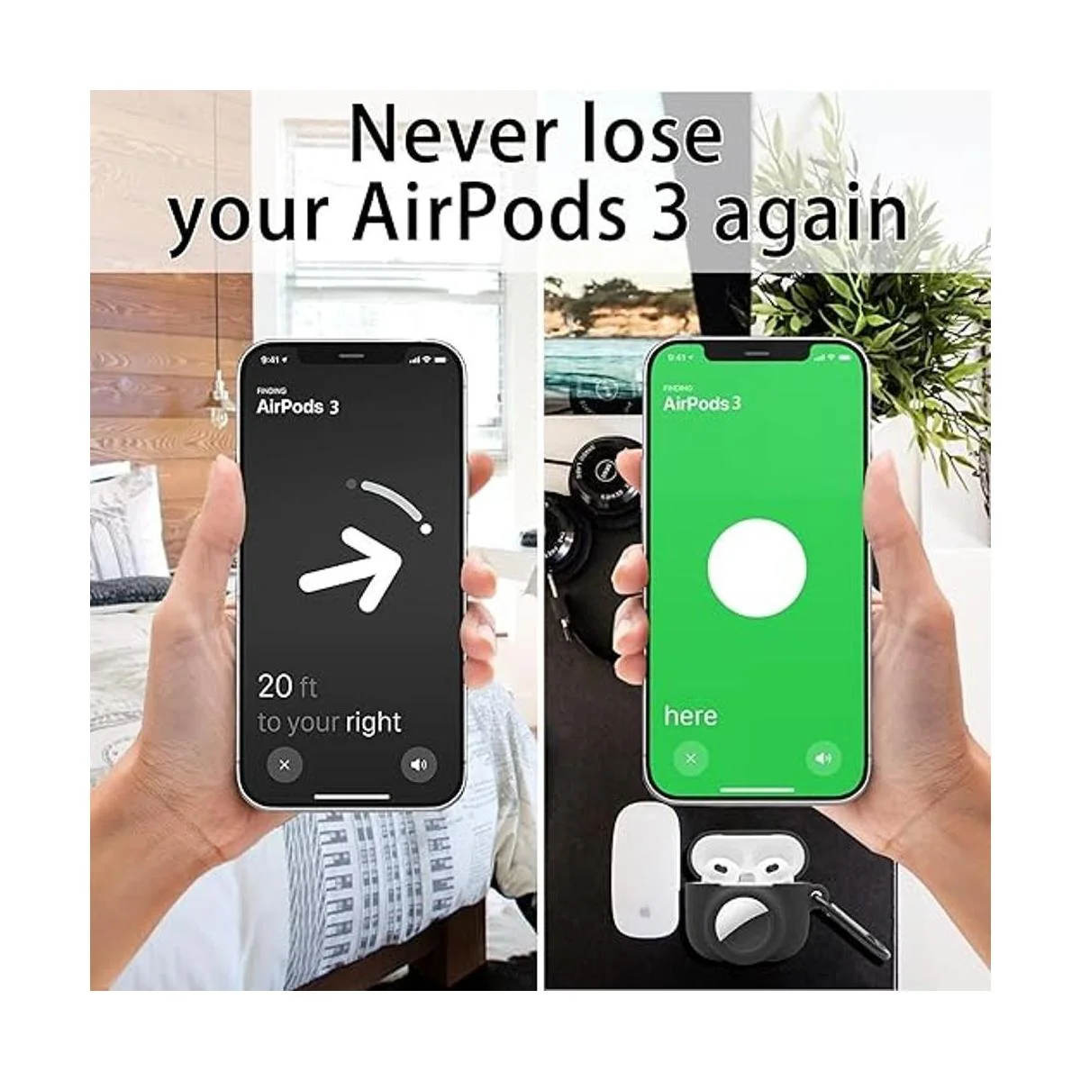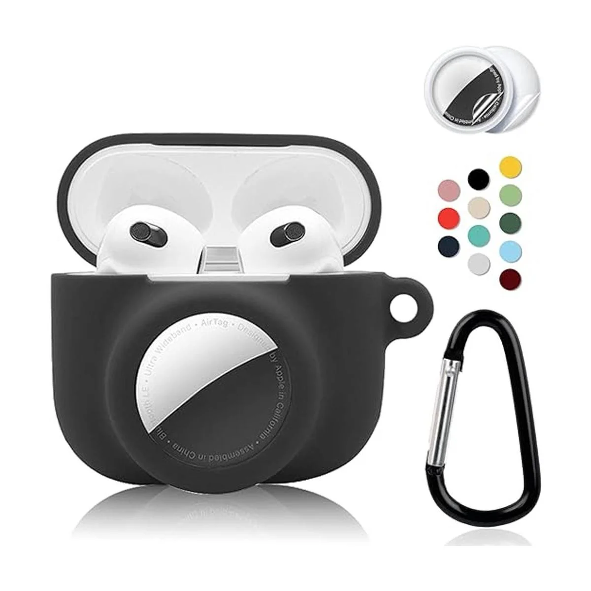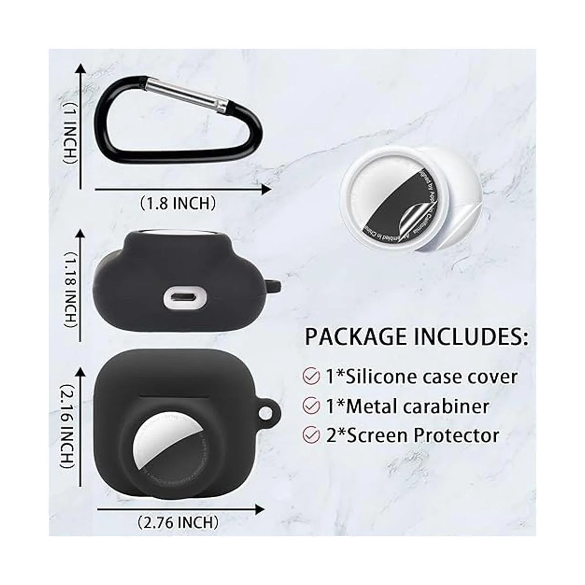 Juego de funda protectora 2 en 1 compatible con Apple AirPods 3 2021 AirTag, soporte de rastreador GPS con 2 protectores de pantalla de TPU y llavero, funda de silicona suave antiarañazos y antiarañazos negro