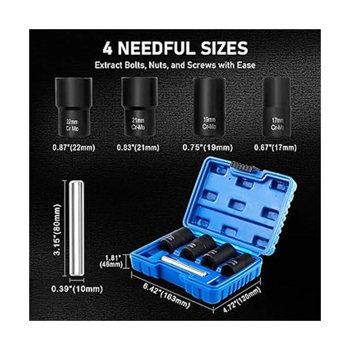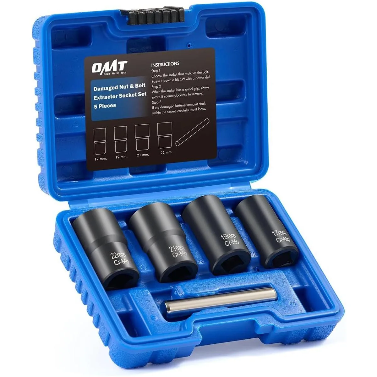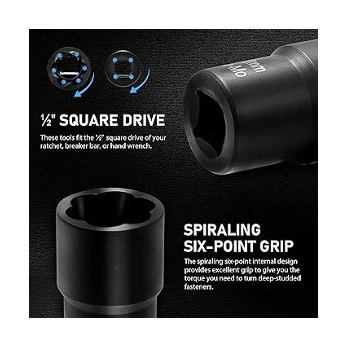Juego de 5 piezas: este juego de enchufes Orion Motor Tech incluye 4 enchufes giratorios en los tamaños métricos más comúnmente necesarios, 0.669 in, 0.748 in, 0.827 in y 0.866 in, para reemplazar rápidamente tuercas y pernos oxidados, redondeados o pelados. La barra de perforación central de 0.472 in saca las tuercas removidas mientras avanzas.