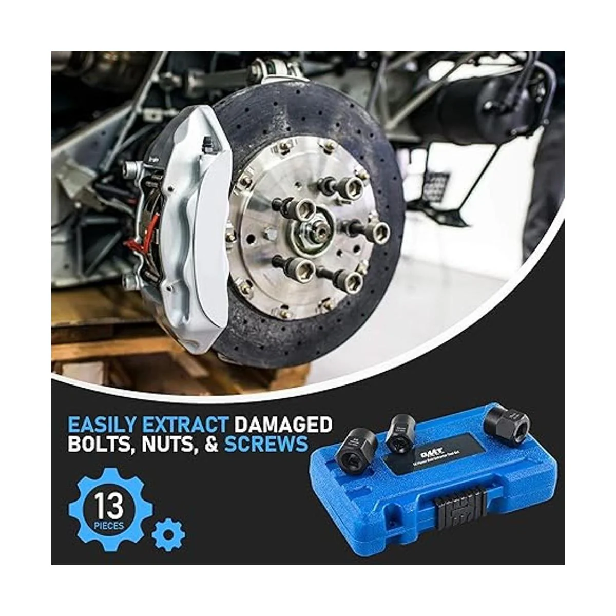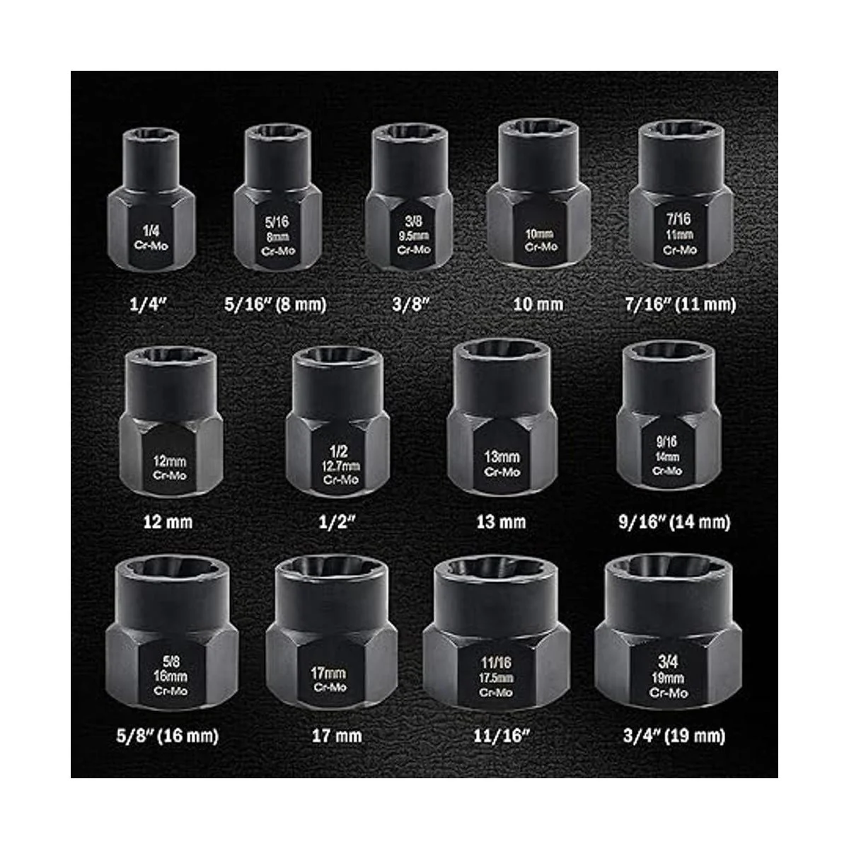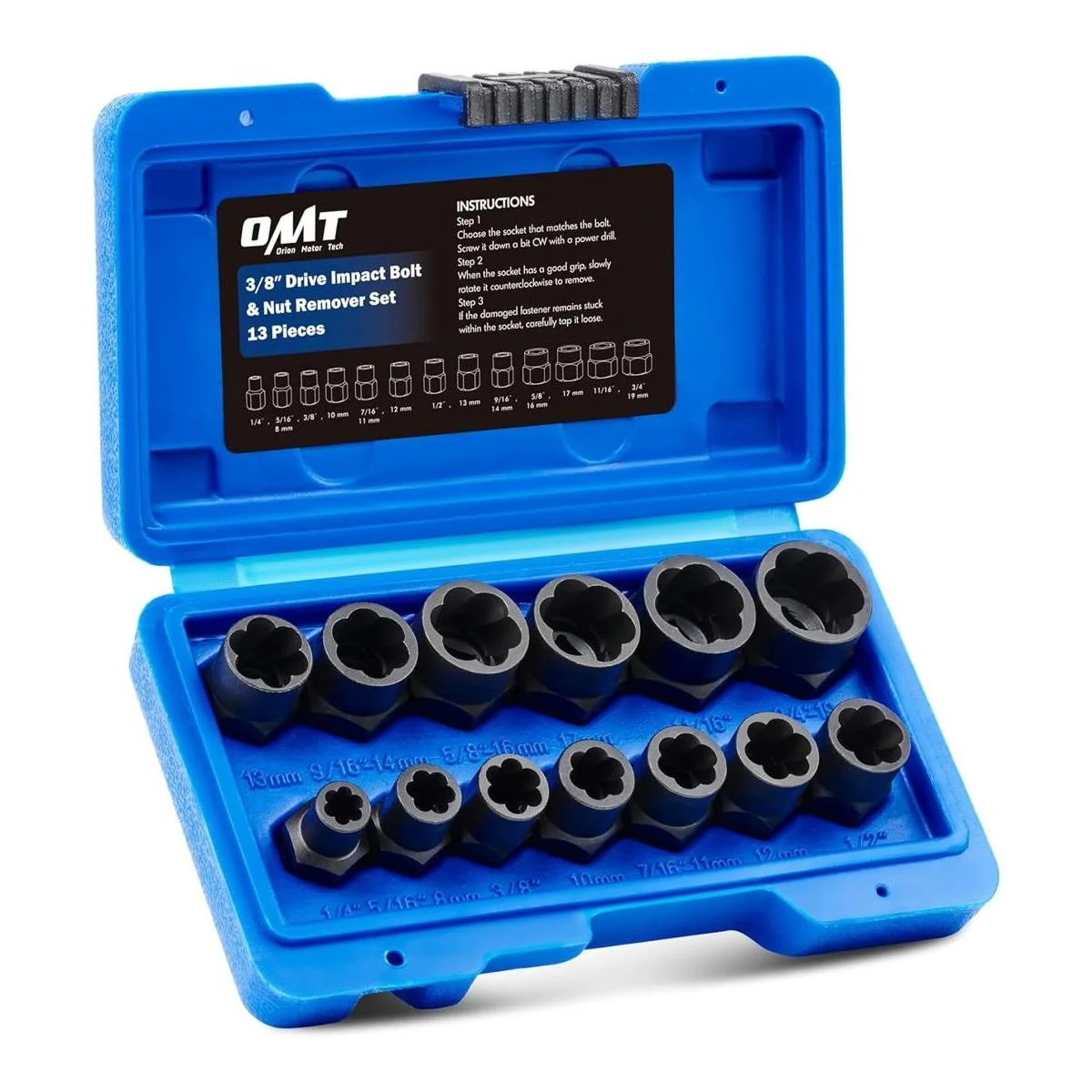 Juego de herramientas de extracción de tuercas y pernos de impacto, kit de herramientas de extracción de tuercas y pernos, juego de tornillos de tuerca en 13 tamaños SAE y métricos para accionamiento de 38 pulgadas con estuche