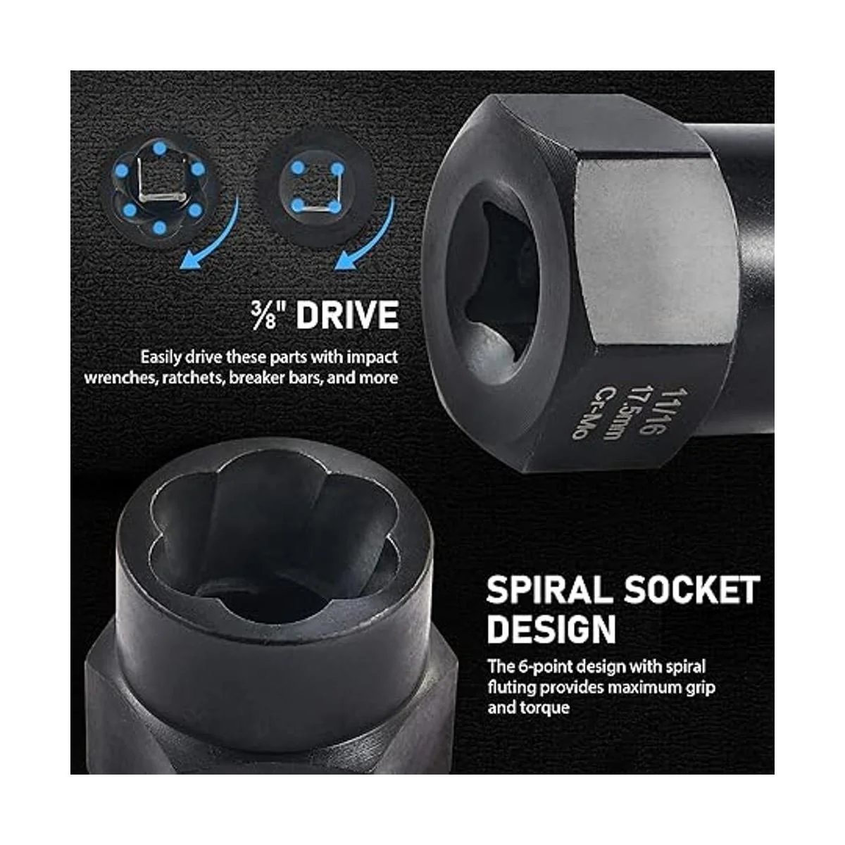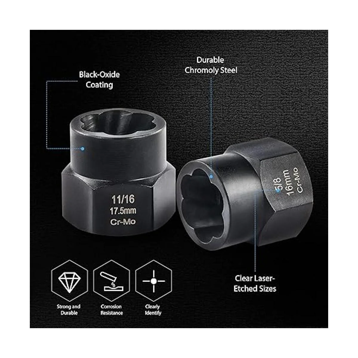 Agarre en espiral de 6 puntos: cada parte de este juego de enchufes para extracción de tuercas obstinadas tiene seis puntos de contacto y un diseño en espiral interior para ofrecer el máximo agarre y torsión mientras arrancas tuercas dañadas, corroídas y recubiertas, pernos, orejetas, pernos, tornillos hexagonales y más