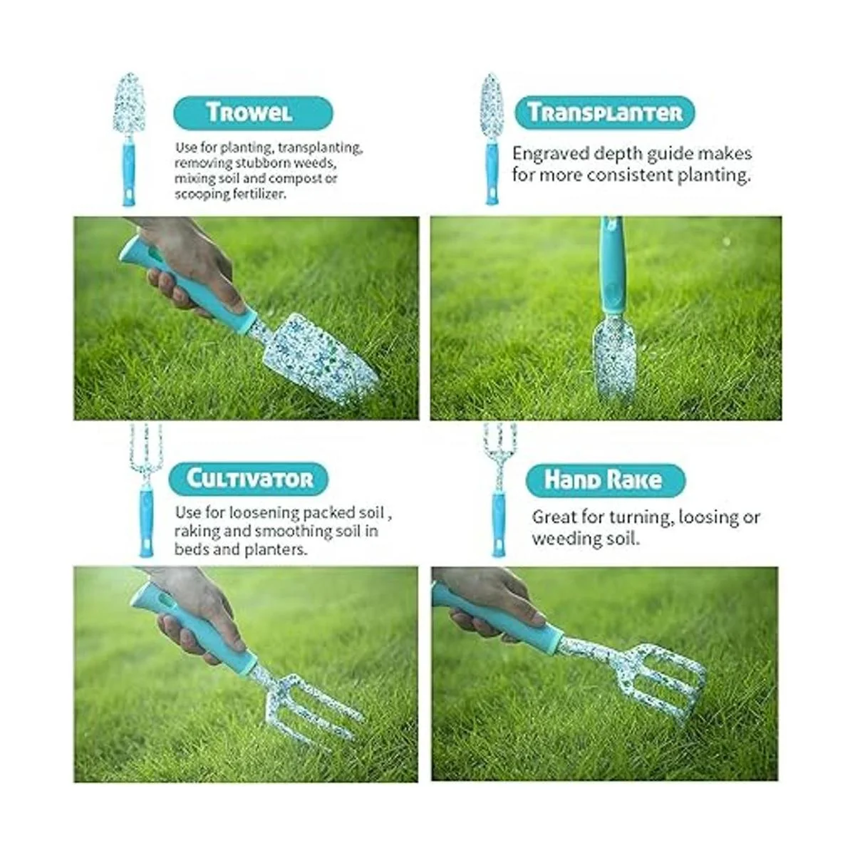 Materiales duraderos: las herramientas manuales de jardinería están hechas de aleación de aluminio resistente, resistente al óxido y resistente. El diseño ergonómico y el agarre de goma antideslizante son cómodos para tus manos y hacen frente fácilmente a varios trabajos de jardinería