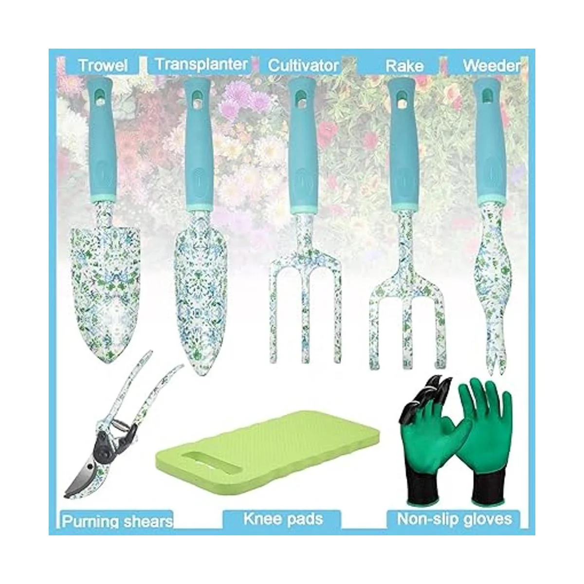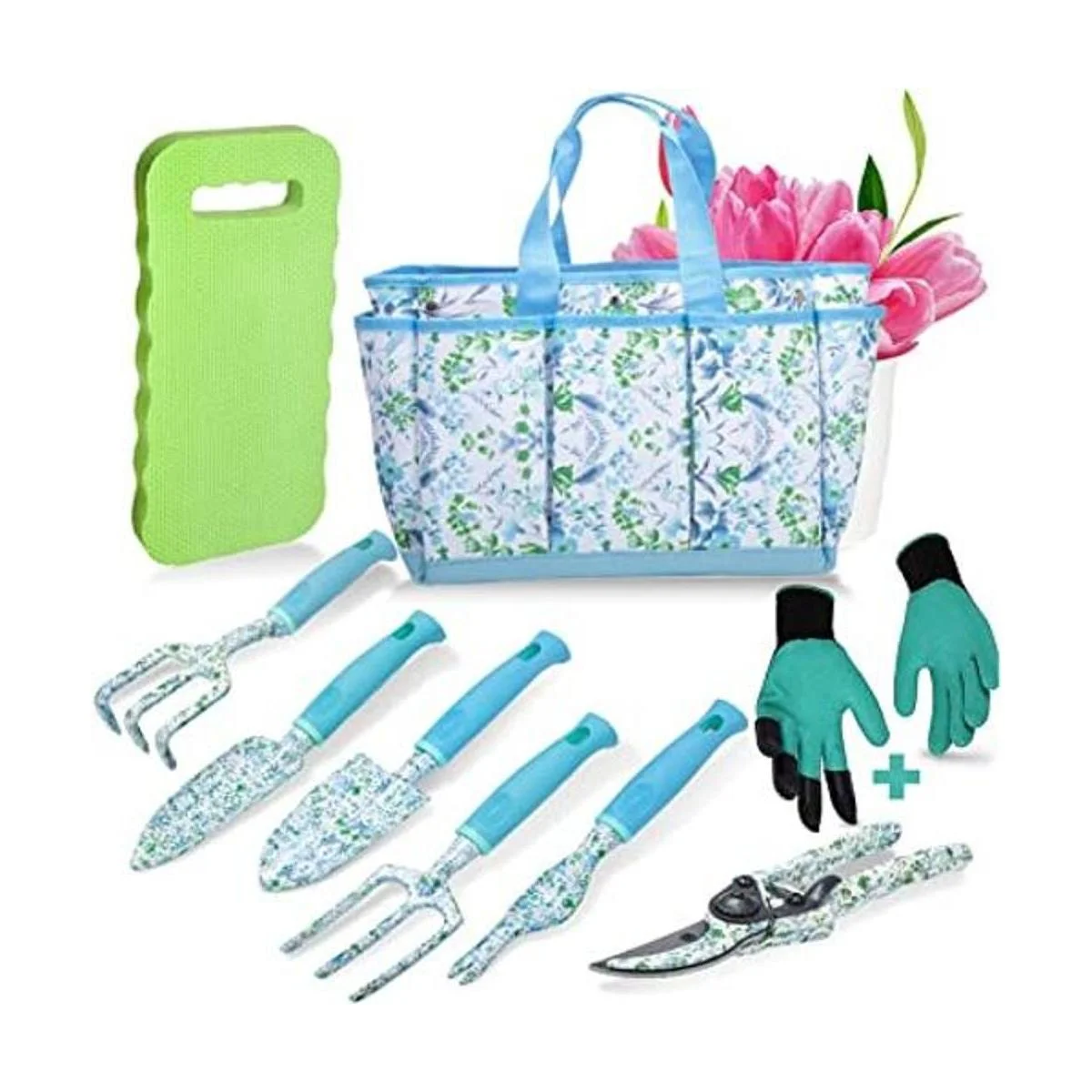 Juego de herramientas de jardín de aleación de aluminio de 9 piezas, kit de herramientas de mano de regalo para mujeres y padres suministros de jardinería con guantes, bolsa, almohadilla de rodillas, podadora de mano, paleta, rastrillo de mano, deshierbe, tenedor, trasplantador