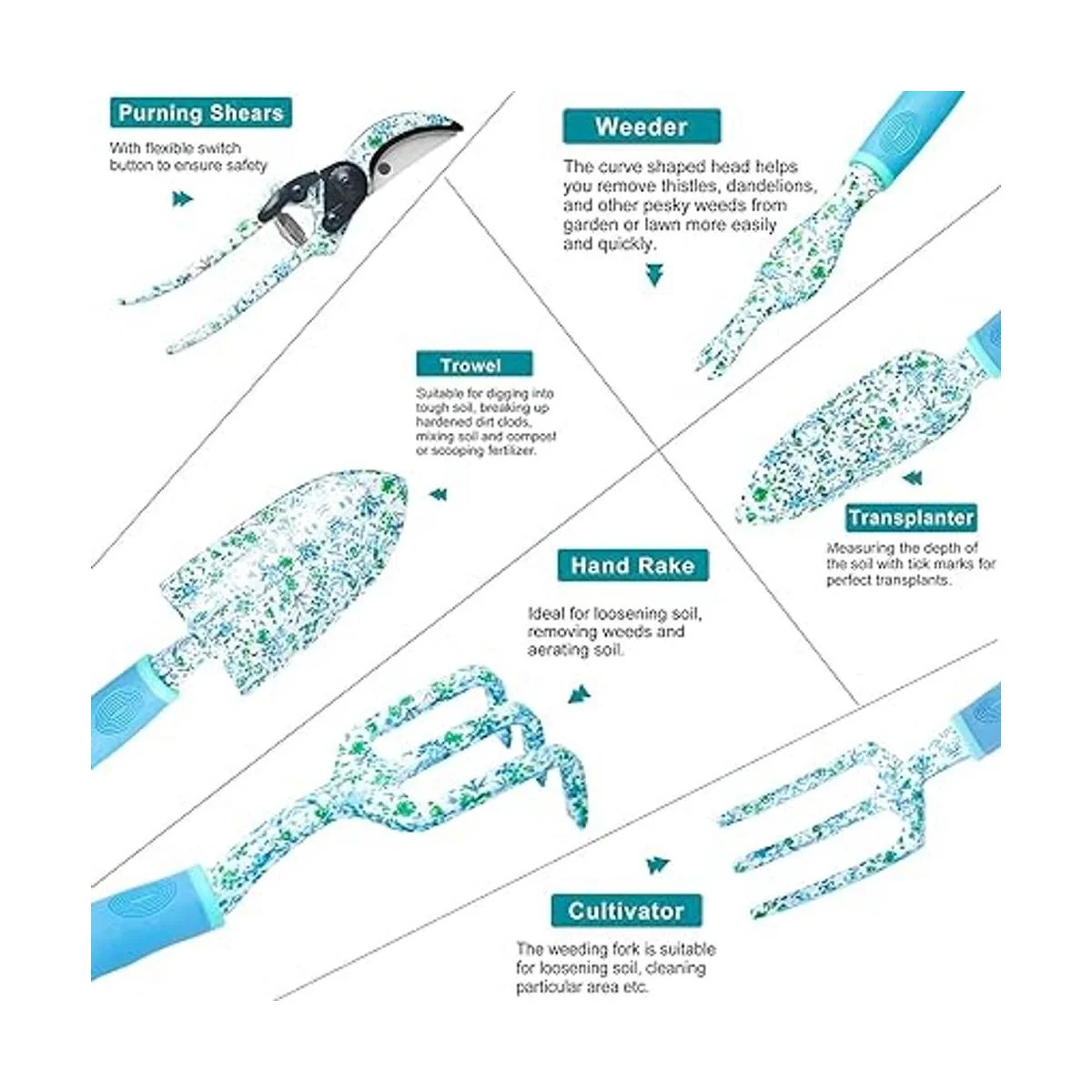 Satisface tus necesidades diarias: el juego de 9 herramientas de jardín incluye una práctica bolsa de mano, cizalla de poda, paleta de jardín, trasplantador, deshierbe, tenedor de mano, rastrillo, almohadilla de rodillas y guantes de jardín, te ayuda a podar, cavar, malezar, airear y plantar
