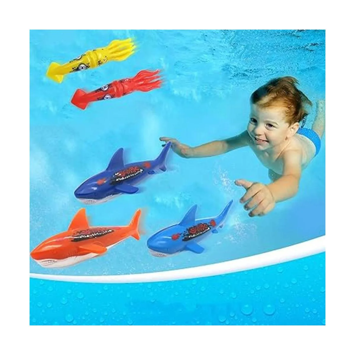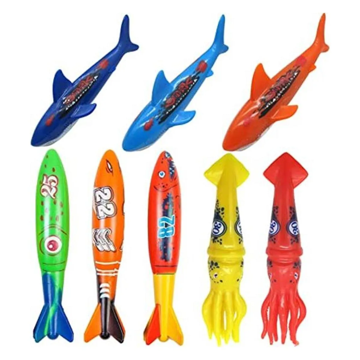 Contenido del paquete: 8 juguetes de buceo para piscina de 5.11 pulgadas 3 torpedos 3 tiburones 2 calamares