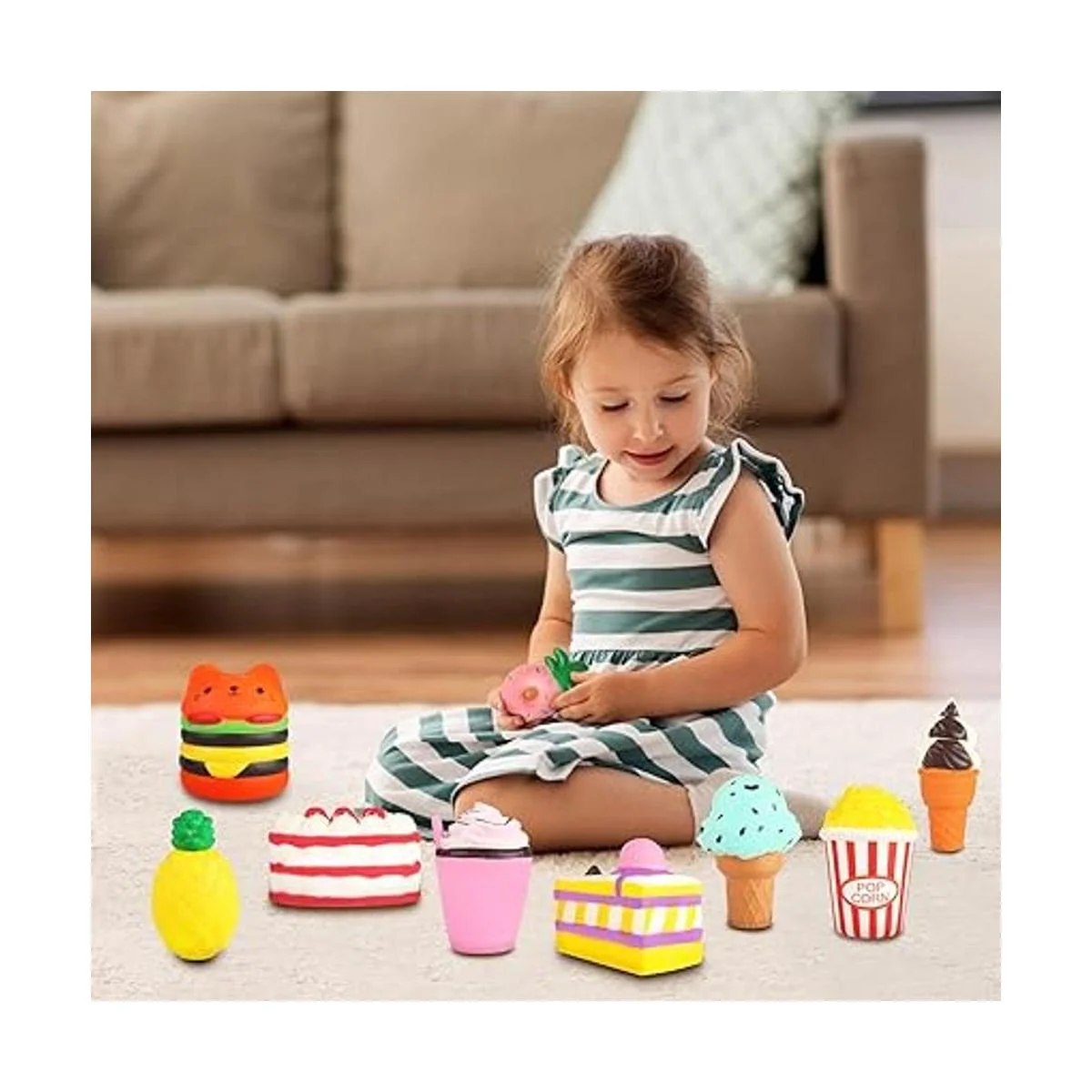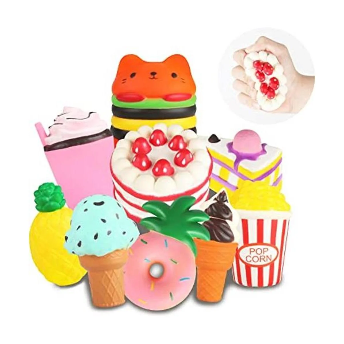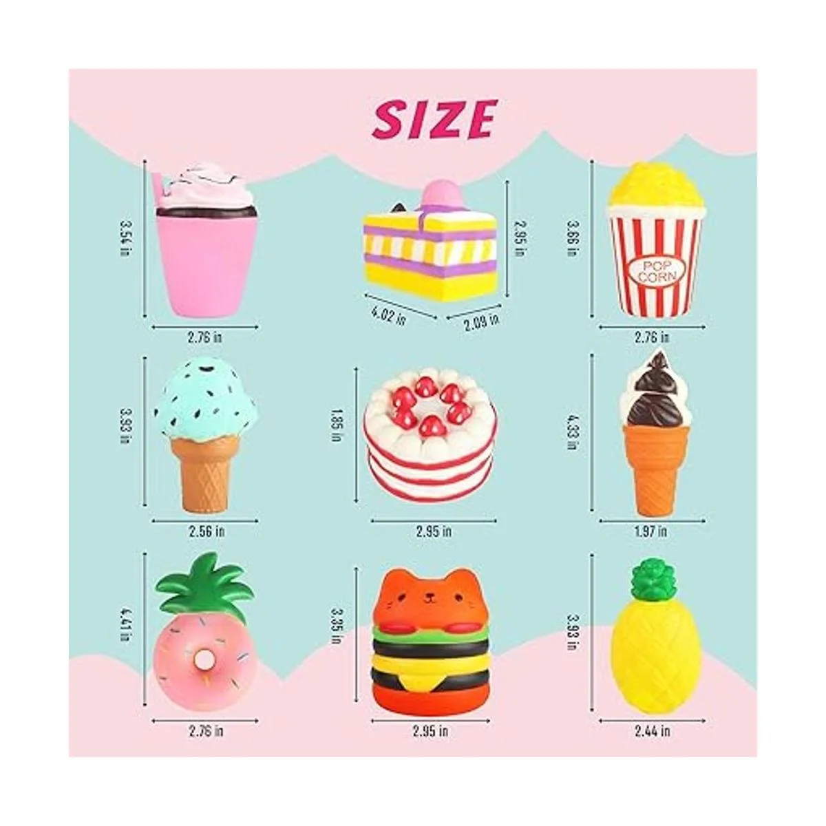 Regalo perfecto para niños 9 piezas de juguetes suaves y esponjosos de tamaño jumbo para amigos. La medida de cada pieza de 3 a 4 pulgadas. El paquete incluye una bonita hamburguesa, palomitas de maíz, pastel, dona, piña y helado en diferentes colores y diseños.
