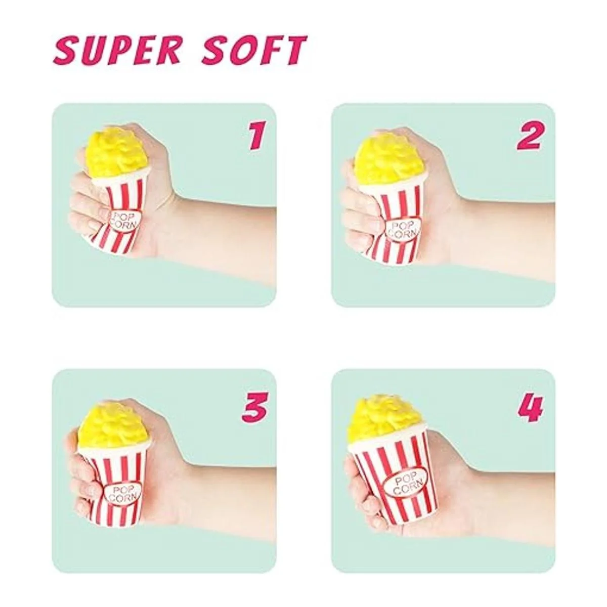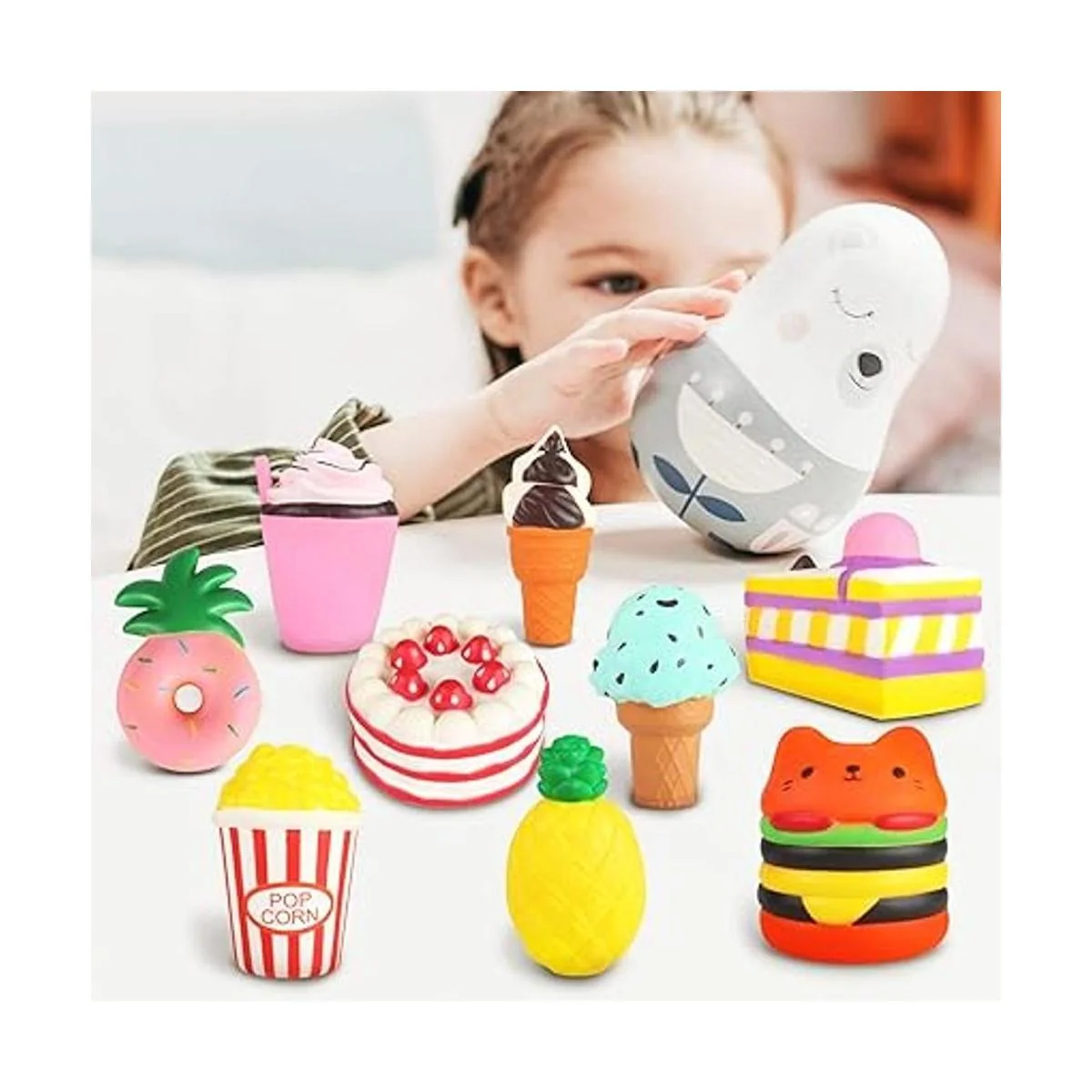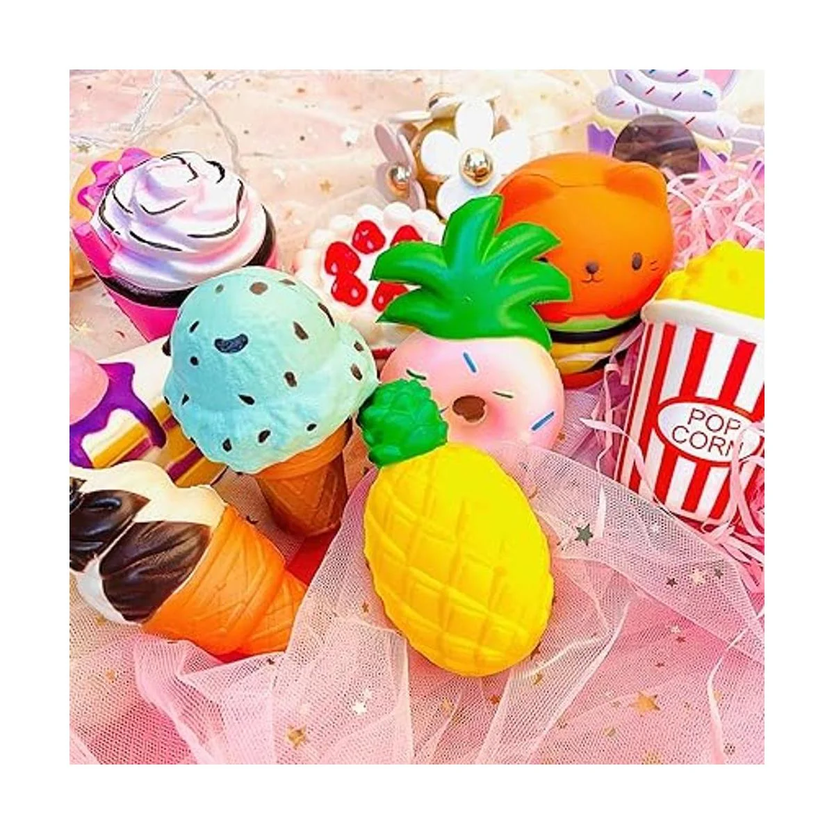 Regalo perfecto para niños 9 piezas de juguetes suaves y esponjosos de tamaño jumbo para amigos. La medida de cada pieza de 3 a 4 pulgadas. El paquete incluye una bonita hamburguesa, palomitas de maíz, pastel, dona, piña y helado en diferentes colores y diseños.