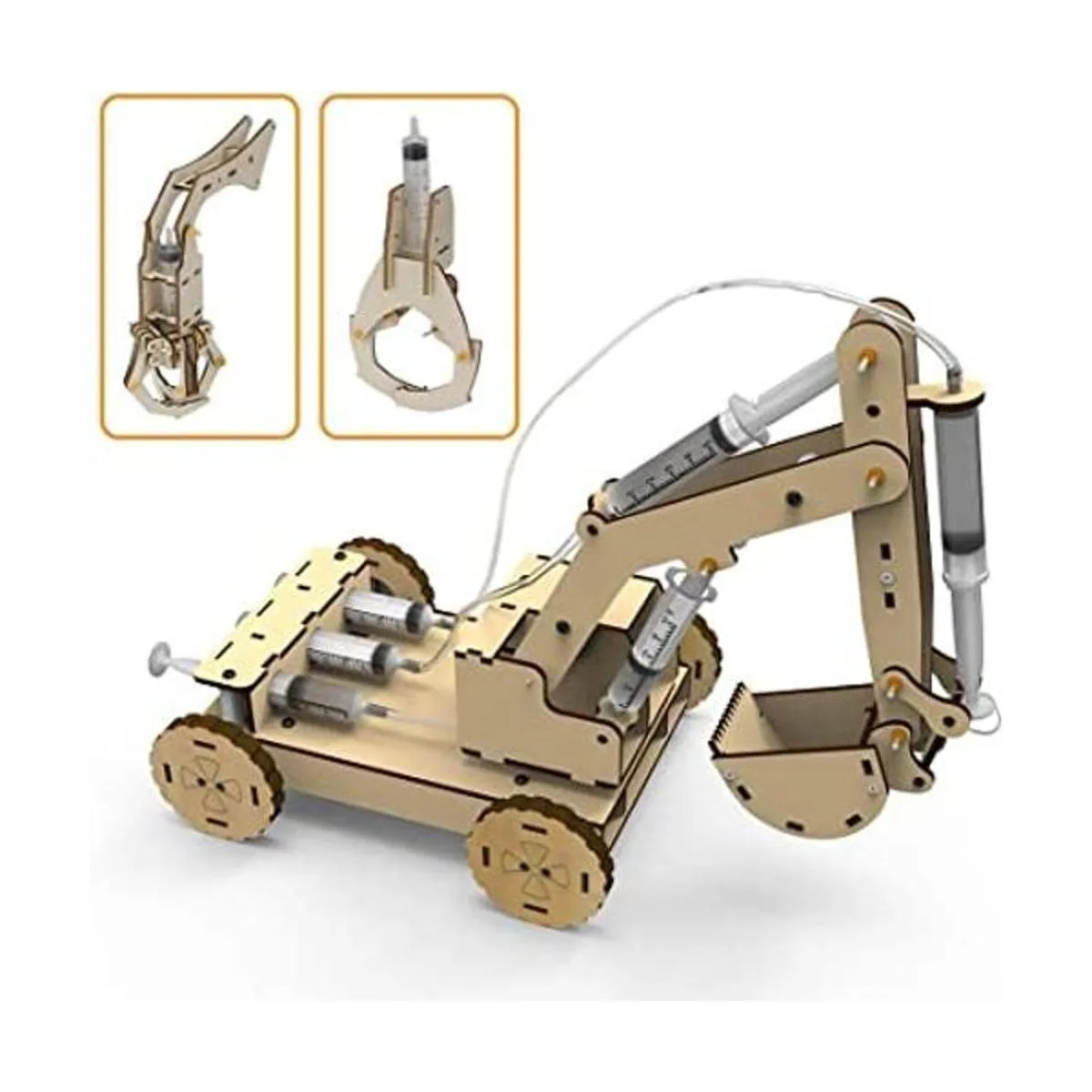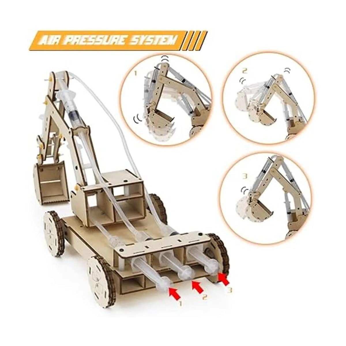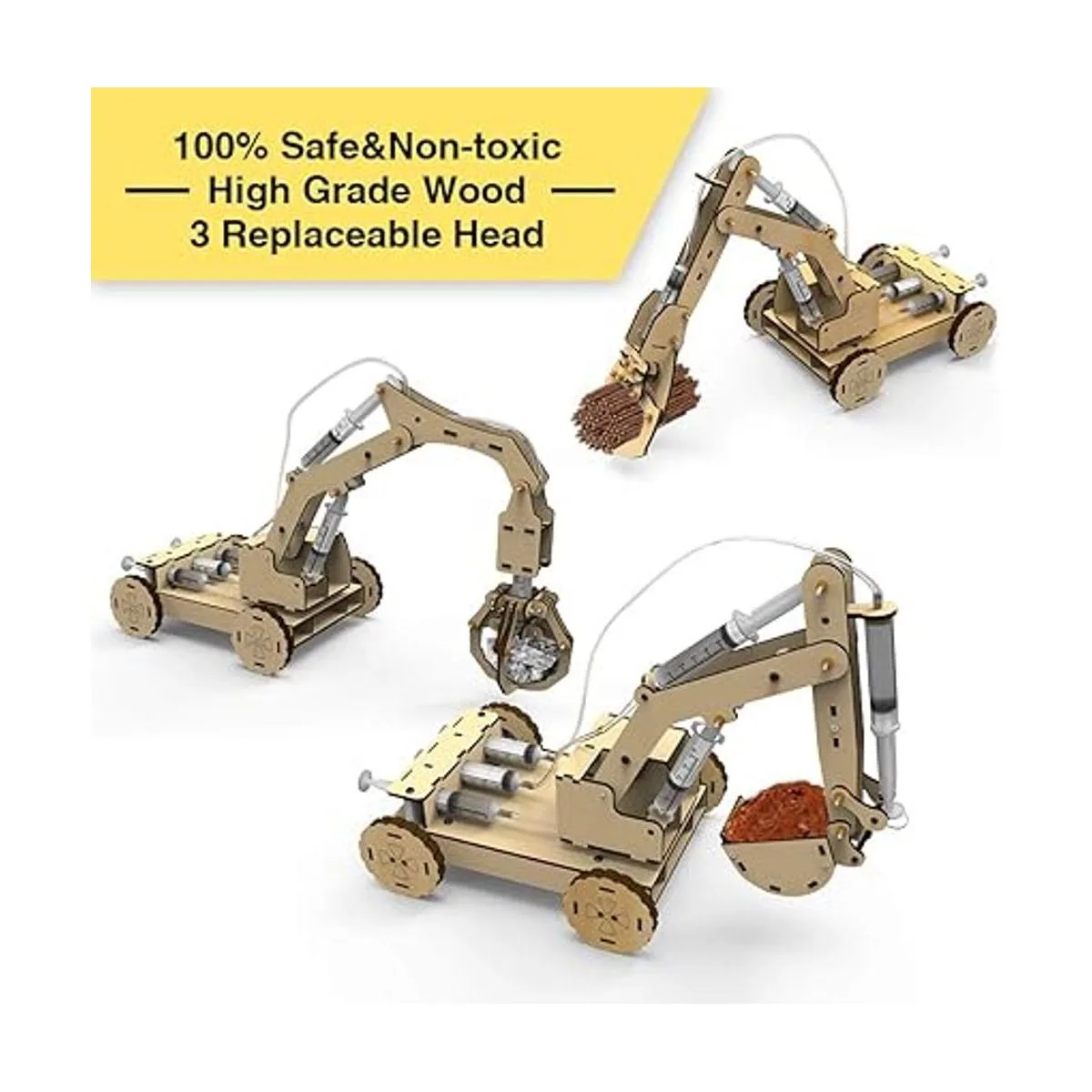 Juego de juguetes para vehículos de excavadora de construcción de madera 3D, kit de ciencia STEM con sistema de presión de aire para construir un modelo de excavadora de madera que incluye 3 pinzas y excavadoras reemplazables para niños