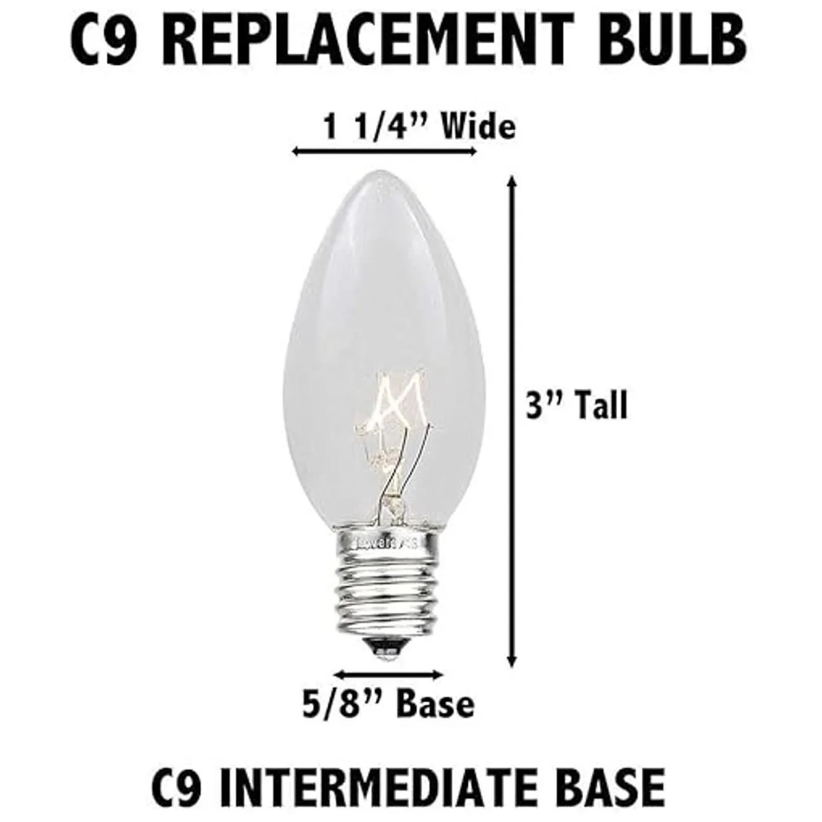 Cada foco de C9 es 3 de alto y 1 1/4 de ancho y fabricada con una base de níquel coasted que evita que cualquier deterioro debido a la climatología adversa. satisfacción de nuestros clientes es nuestra prioridad 1 y cada cadena Set viene con una garantía de satisfacción. si usted tiene cualquier problemas todos por favor póngase en contacto con nosotros y se Happy para ayudar en cualquier forma que podemos. disfrutar de las día festivo y relajarse con alta calidad novedad luces.