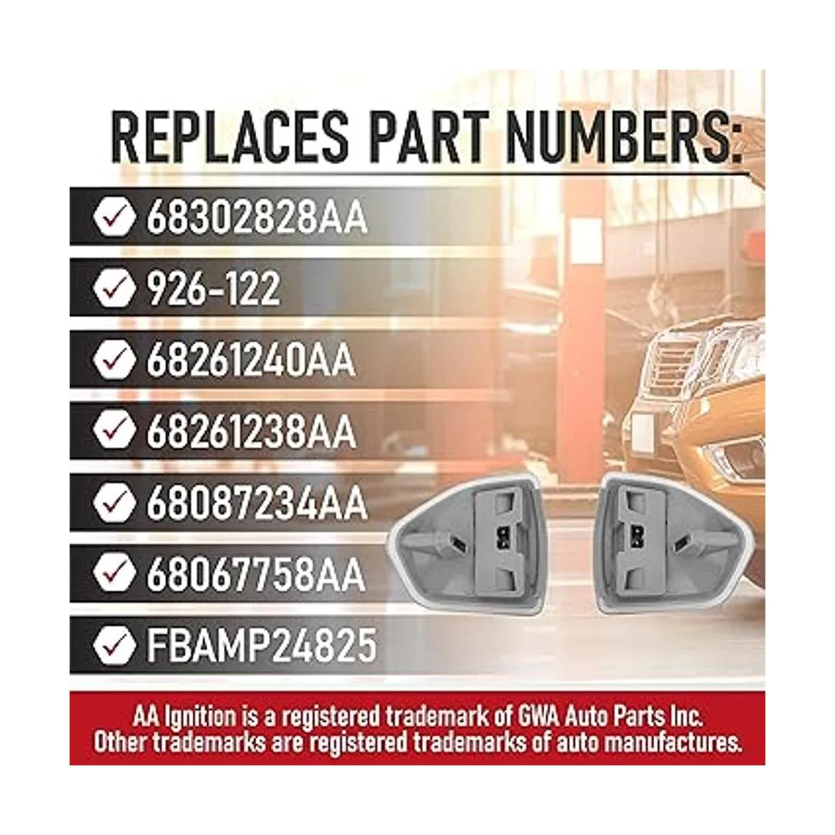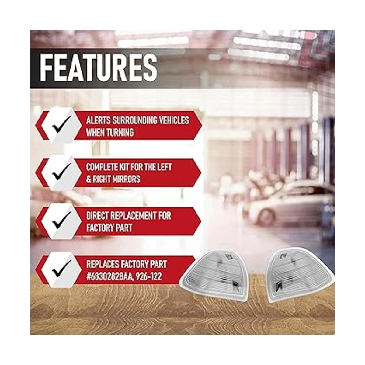 Sustituye la pieza 68302828AA, 926122, 68261240AA, 68261238AA, 68087234AA, 68067758AA, FBAMP24825. Fácil instalación directamente, simplemente retira las luces del espejo lateral izquierdo y derecho, y luego instala el producto. Las luces intermitentes pueden dejar de funcionar con el tiempo y son cruciales para la seguridad de todos en la carretera.