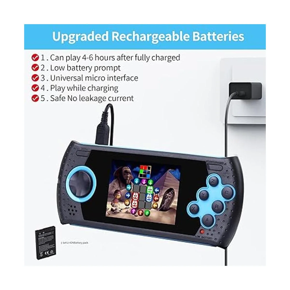 Largo tiempo de uso: batería de litio recargable de 800 mAh de gran capacidad, proporcionando un flujo constante de energía para la felicidad de tu hijo. Ahorra dinero al no tener que comprar y reemplazar las baterías con frecuencia. El juego puede jugar hasta 5 horas cada vez que está completamente cargado. El modo de fuente de alimentación flexible traerá a tu hijo mucha alegría y felicidad durante el viaje o viaje largo. Nota: carga completamente la batería antes del primer uso