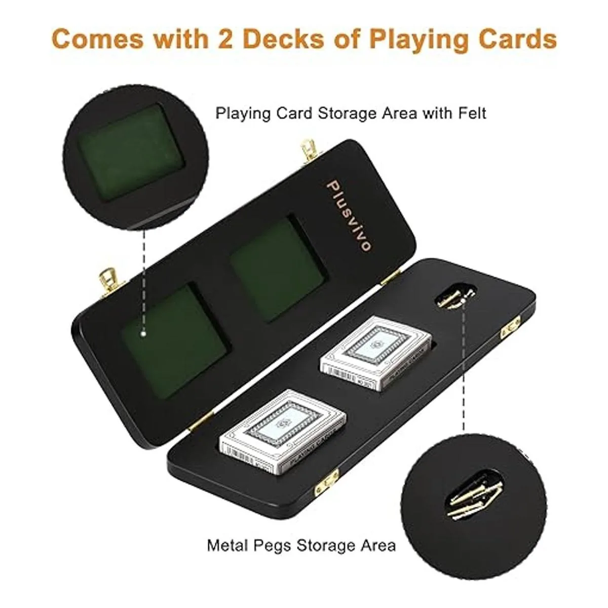 Juego de mesa de cuna de 3 pistas: únete con amigos y familiares para participar en este juego de mesa adictivamente divertido. La tabla de cuna Plusvivo tiene tres pistas, abre la tabla para revelar dos barajas de cartas y nueve clavijas de metal para cuna plata, oro y negro.