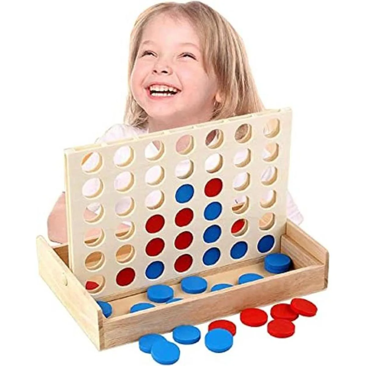 Juego de mesa de madera 4 en una fila plegable con 4 juguetes clásicos para la familia, juguete educativo para niños y familia