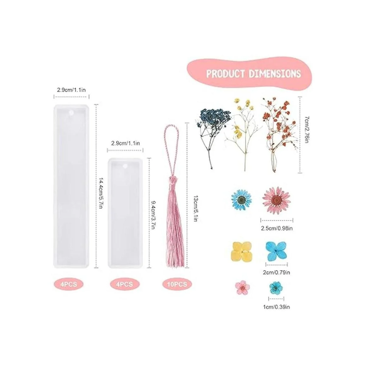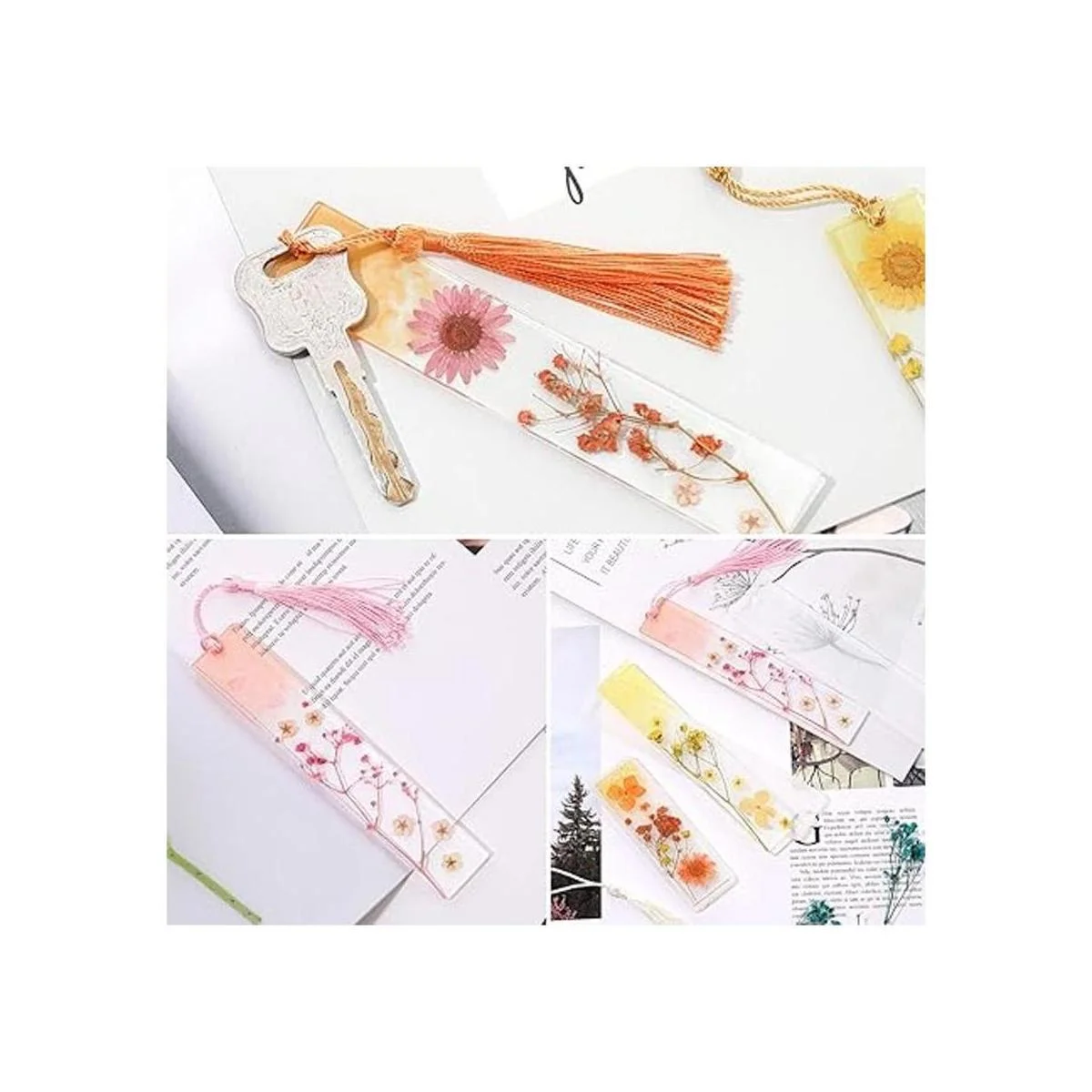 Lo que recibirás: el paquete viene con 8 moldes de resina marcapáginas, incluyendo 4 piezas de tamaño mediano y 4 piezas en tamaño pequeño, 10 borlas coloridas y 1 paquete de flores secas en 20 piezas, puedes hacer 8 marcadores diferentes a la vez, suficiente para tus diferentes necesidades de bricolaje