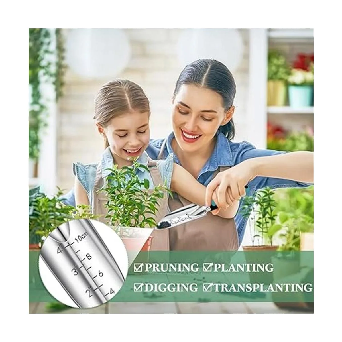 2 estilos diferentes de pala: recibirás 2 palas de jardín con diferentes estilos, el mango es de color brillante; una de las palas está diseñada con 2 unidades estándar transparentes de escala de profundidad pulgadas y centímetros, ideal para eliminar la suciedad, cavar agujeros, medir una profundidad óptima o trasplantar pequeñas plantas y flores