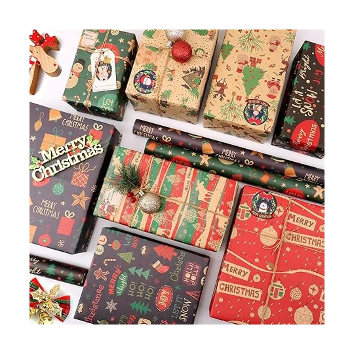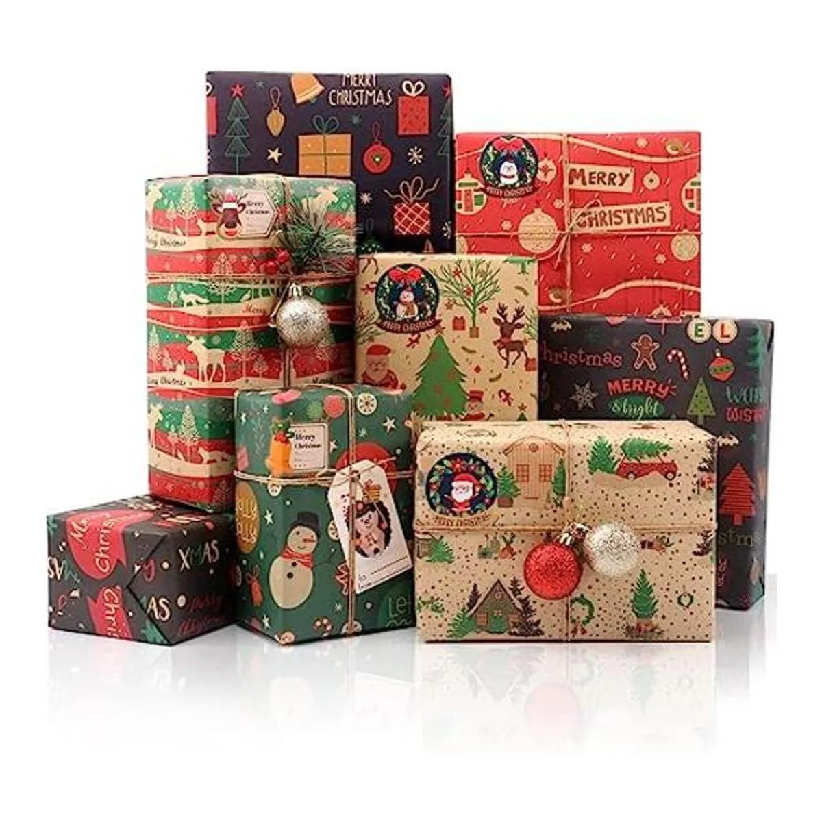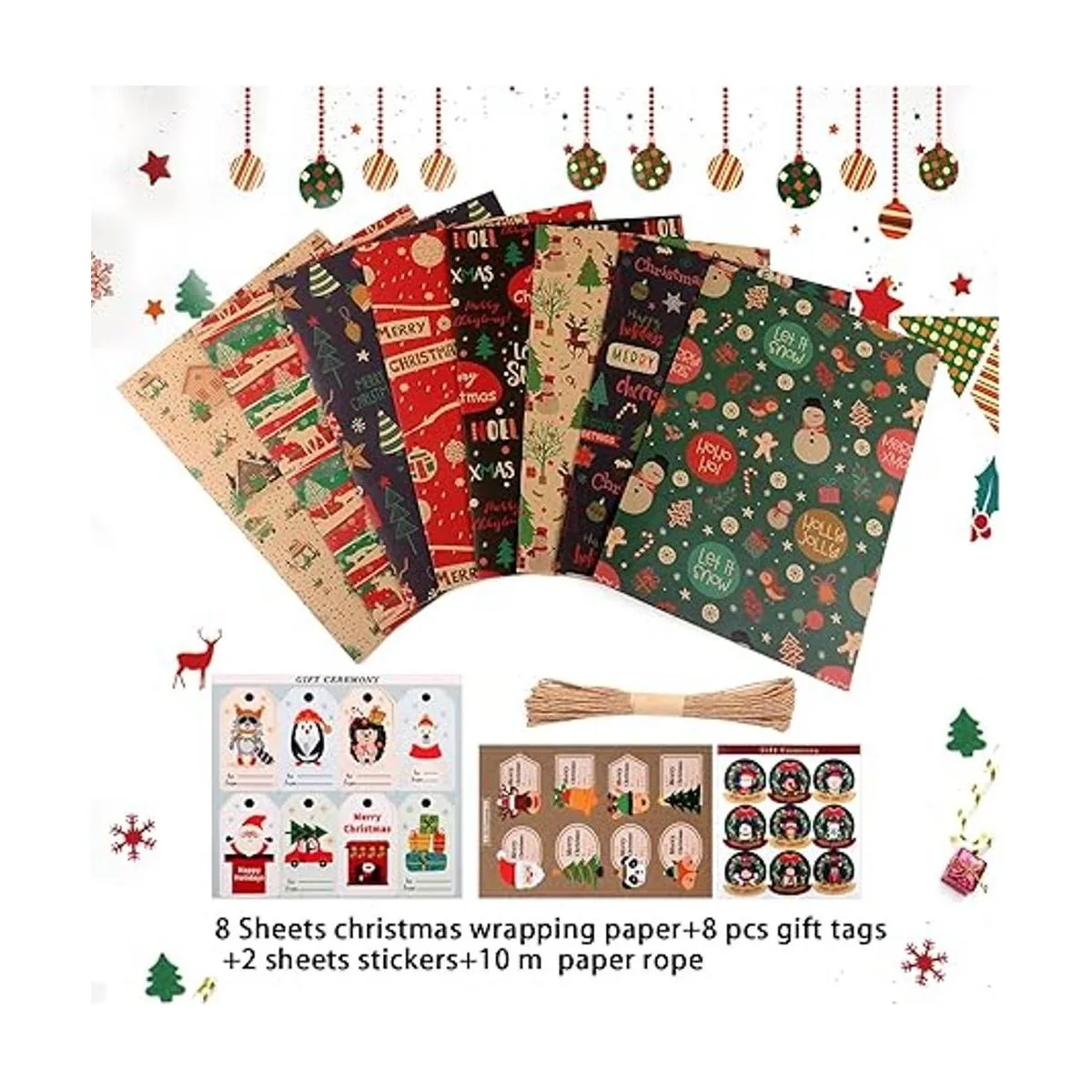 Juego de papel kraft de regalo de Navidad: recibirás 8 hojas de papel kraft decorativo de Navidad con 1 hoja de calcomanías 9 piezas y 2 etiquetas de hoja 8 piezas. Solo tienes que comprar un juego y obtendrás un paquete de regalo de gran valor, que puede satisfacer tus necesidades de envoltura de regalos de fiesta de Navidad y decoración