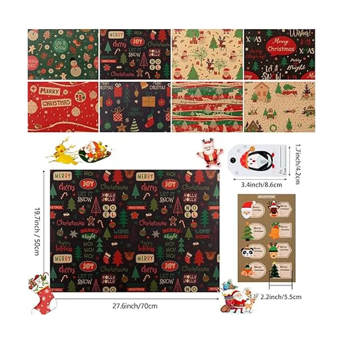 Juego de papel de regalo de Navidad, 8 hojas de papel de regalo recicladas, papel de regalo de Papá Noel, muñeco de nieve, alce, diseño de feliz Navidad, papel de regalo con etiquetas adhesivas para envoltura de regalos, decoración de vacaciones, bricolaje, 27.6 x 19.7 in