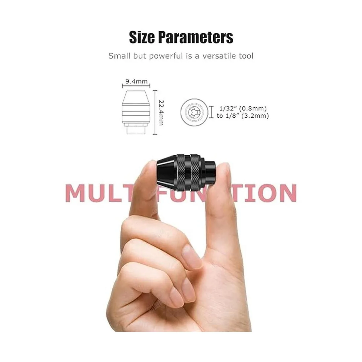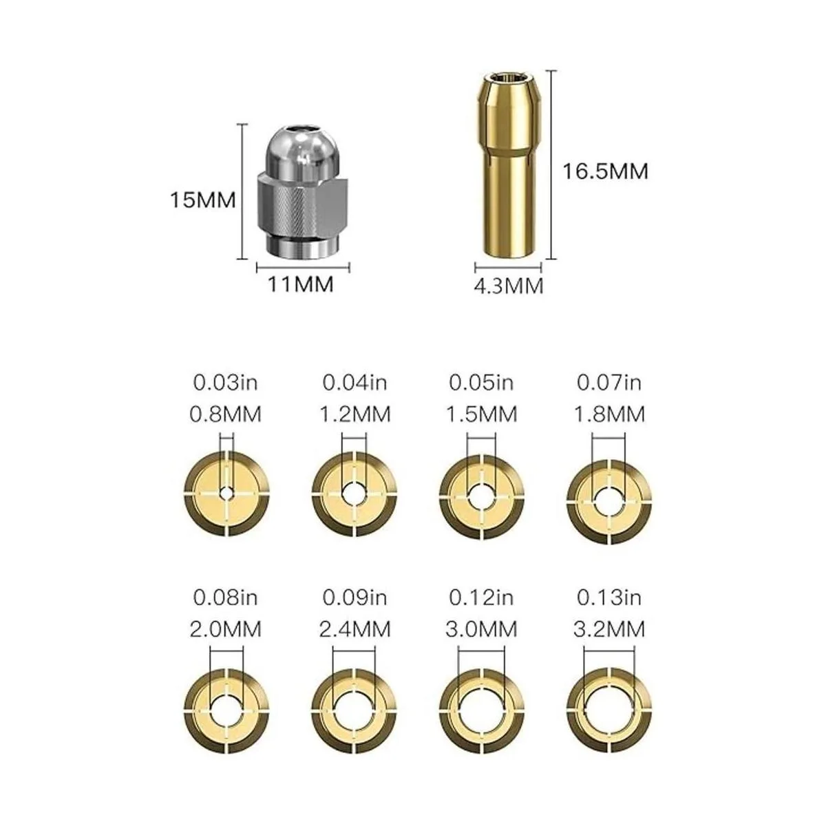 Los mandriles sin llave de cambio rápido tienen varios accesorios con tamaños de vástago de 1/32 a 1/8 pulgadas. Presta atención a medir el tamaño de contraste antes de comprar.