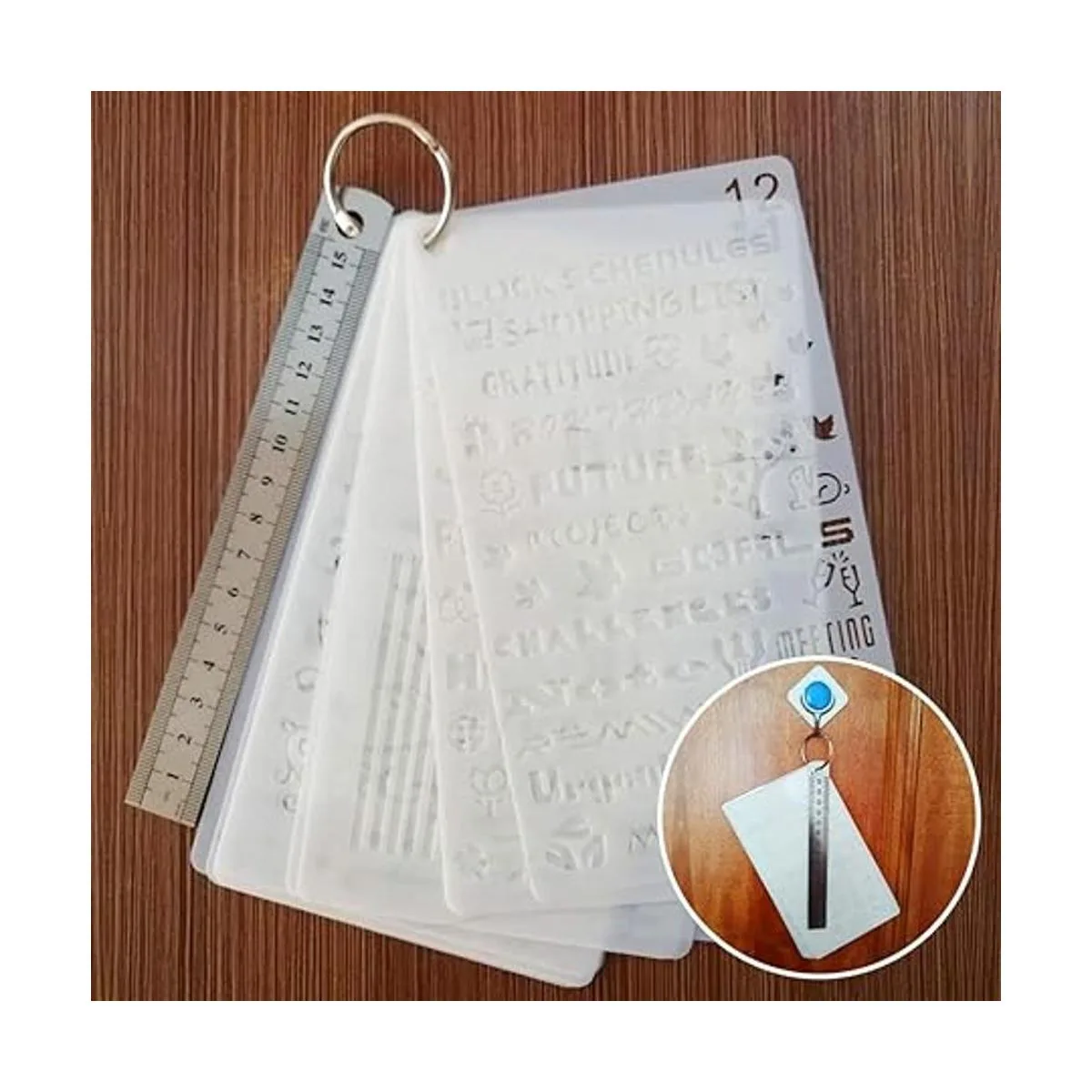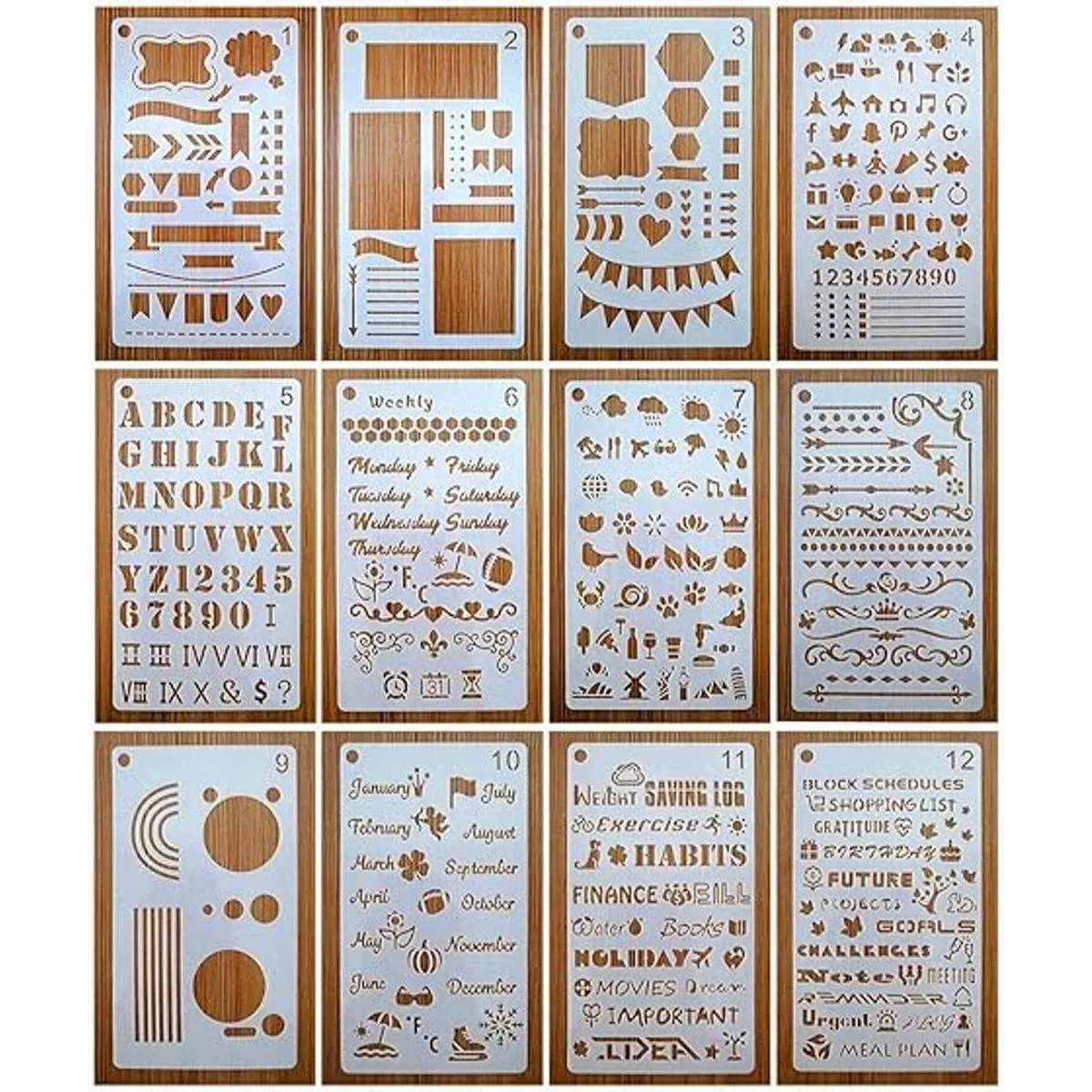 Plantillas básicas para principiantes: este paquete de 12 plantillas de plástico ofrece una amplia variedad de opciones de diseño y estilos, incluye plantillas de letra/números, plantillas de dibujo, pancarta, iconos, gráficos, formas y más, también incluye una regla de acero inoxidable de 6 pulgadas ideal para tareas de medición de precisión, hace que crear tus diarios sea muy fácil, crea cajas, títulos y decoraciones fácilmente