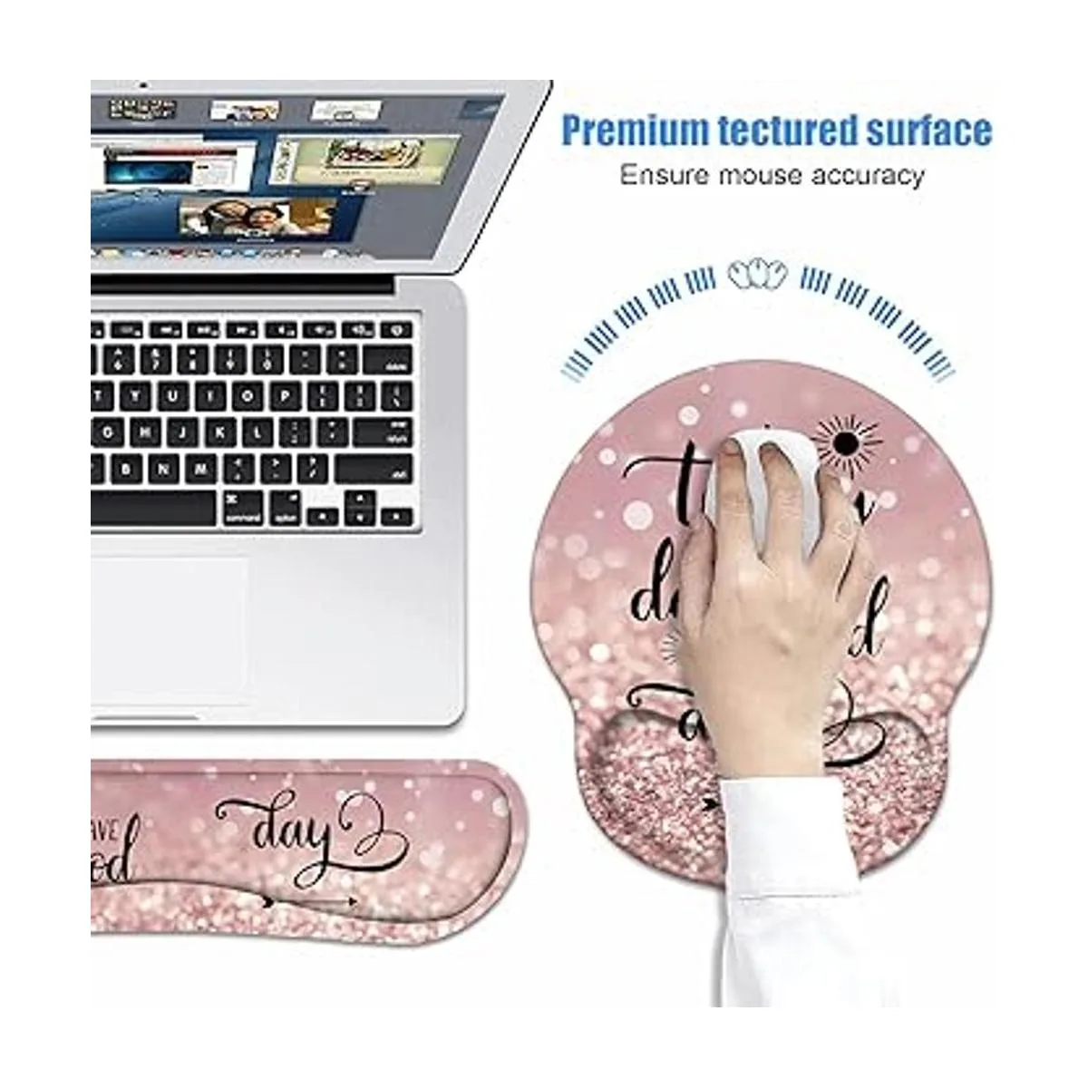 Accesorios óptimos 3 en 1 Incluye un reposamuñecas para teclado 17.32 x 3.34 pulgadas, una alfombrilla para mouse con soporte para muñeca 9.84 x 8.66 pulgadas y un bonito posavasos para tazas como regalo 4 x 4 pulgadas. Accesorios de escritorio de diseño perfecto mientras se utiliza soporte de escritorio, mac o portátil.