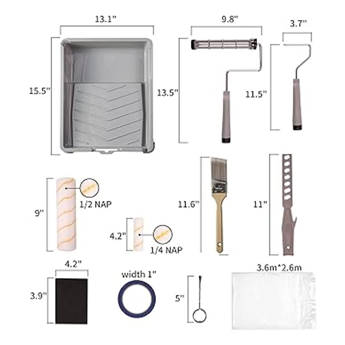 Todo lo que necesitas y más: el paquete incluye: 1 marco de rodillo de pintura de 9 pulgadas, 2 cubiertas de rodillo de 9 pulgadas, 1 mini marco de rodillo de 4 pulgadas, 4 mini cubiertas de rodillo de 4 pulgadas, 1 palo de pintura, 1 abrelatas de pintura, 1 pincel de pintura de 2 pulgadas, 1 bandeja de pintura de 9 pulgadas, hojas de polvo y cinta de máscara, 1 bloque de esponja para molienda. Solo añadir pintura a la pared kit de pintura y ya estás listo para usar