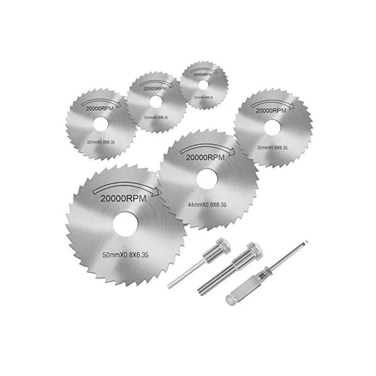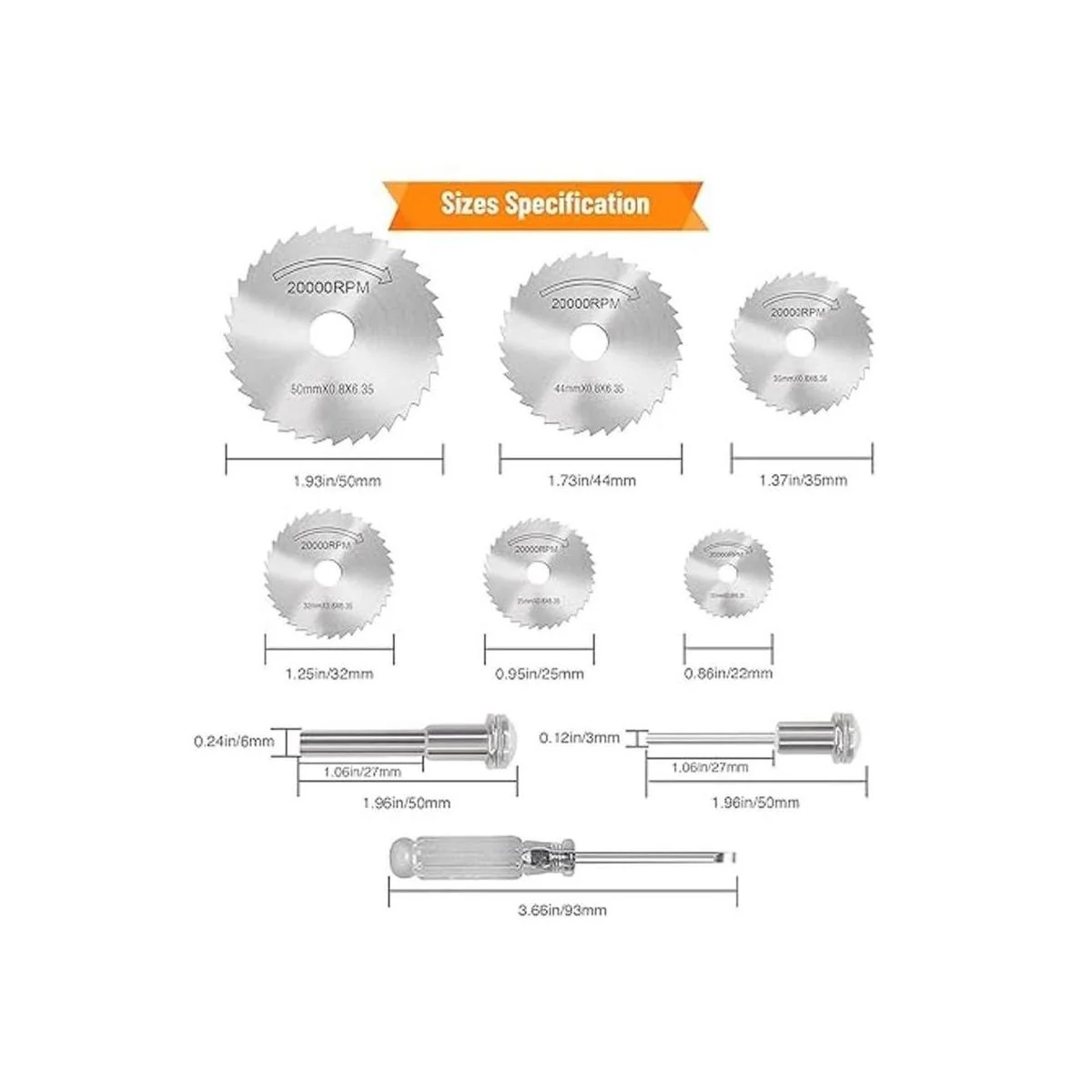 4. Juego de 6 mini hojas de sierra circular: 6 tamaños diferentes 0.866 in, 0.984 in, 1.260 in, 1.378 in, 1.732 in, 1.969 in, tamaño del mandril: 0.125 in y 0.236 in, tamaño del destornillador: 0.512 in.