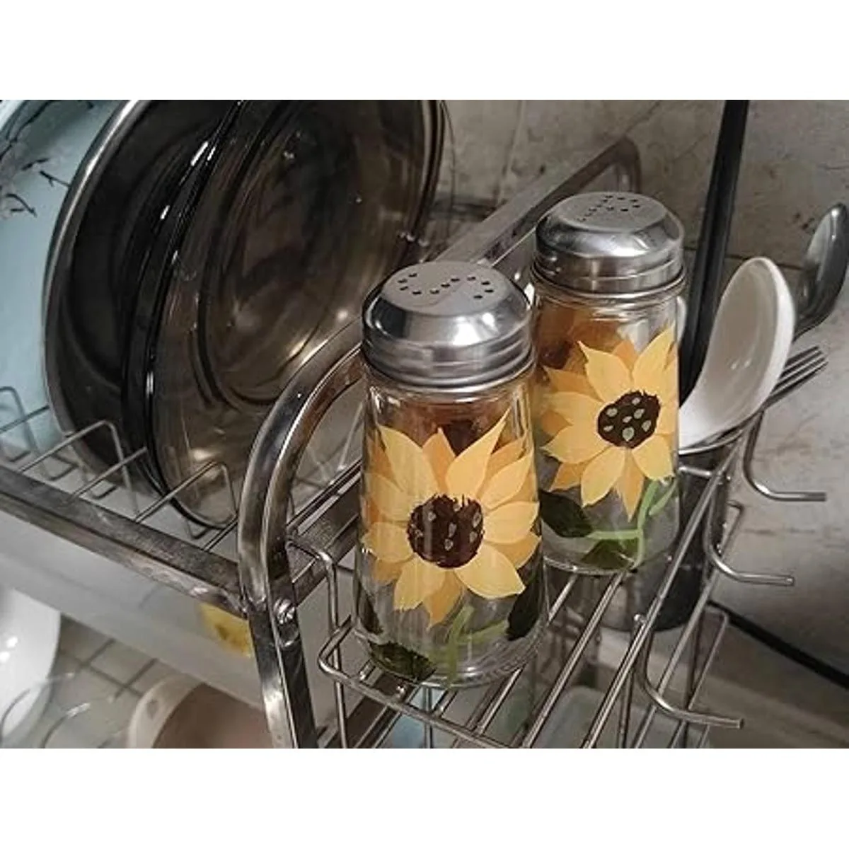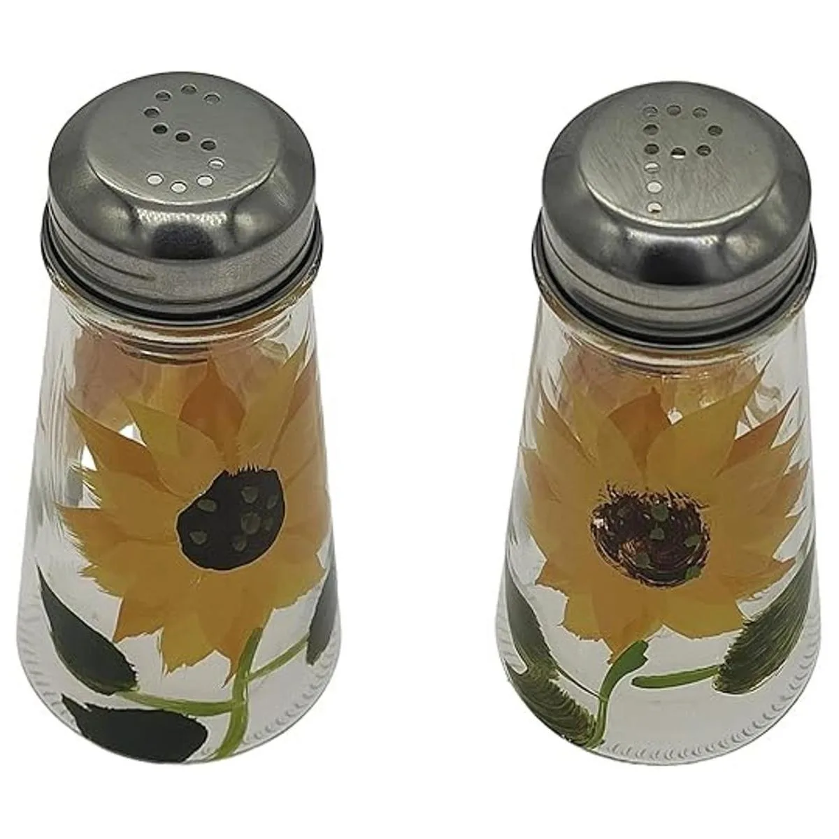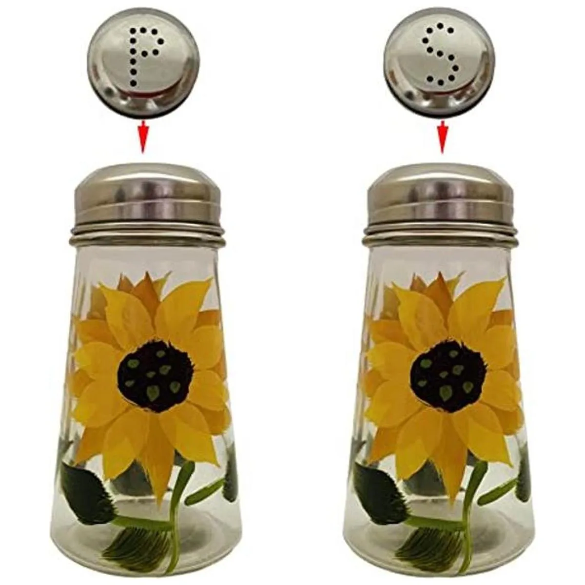 Juego de salero y pimentero pintado a mano con tapas de acero inoxidable S y P 2, girasoles
