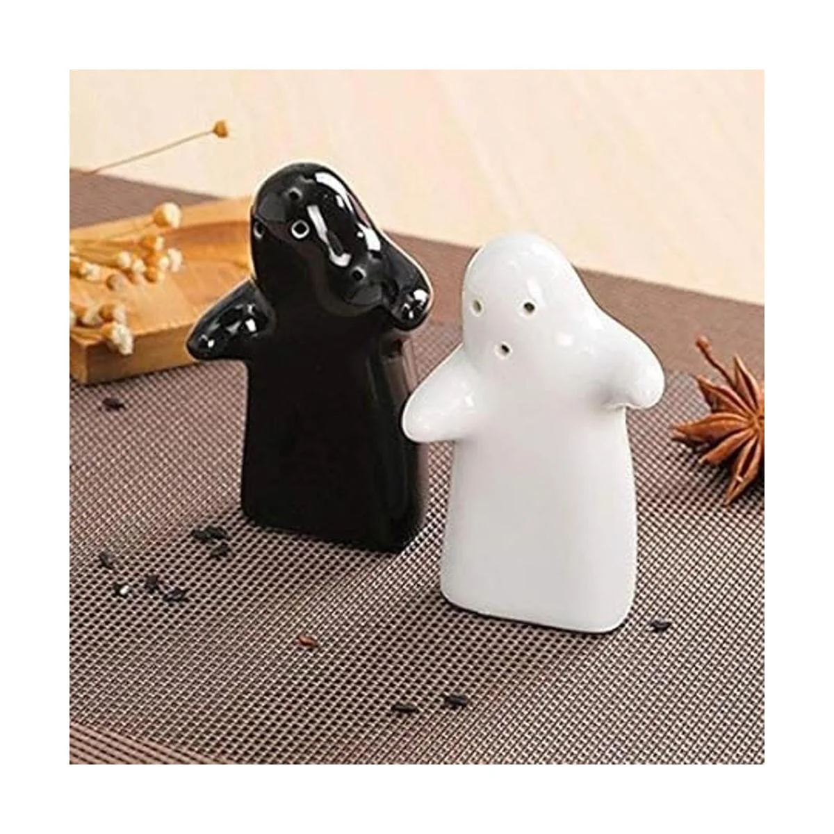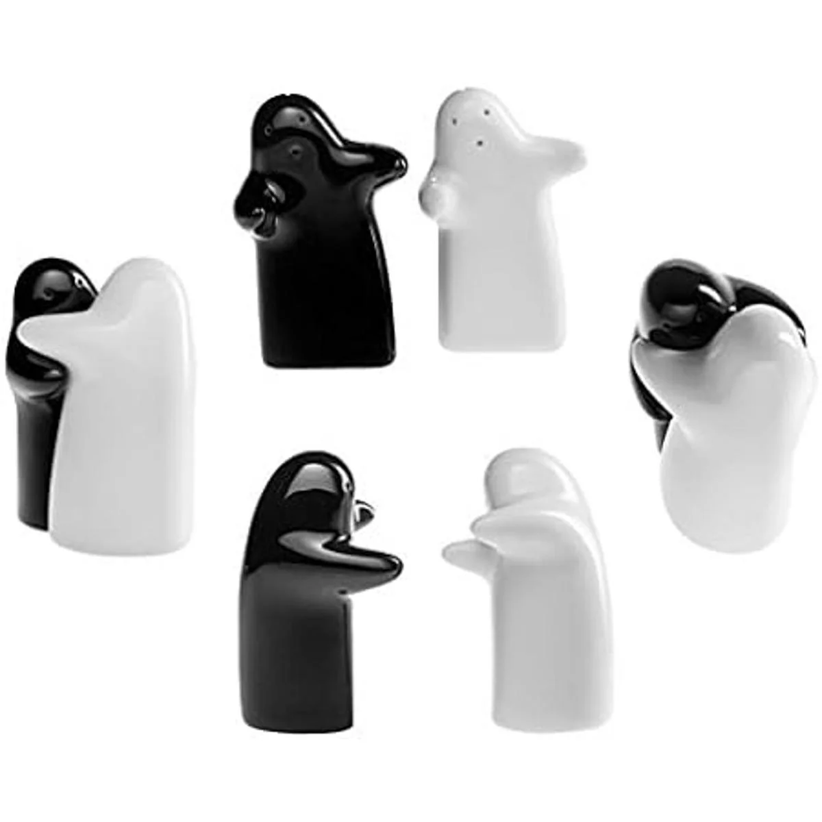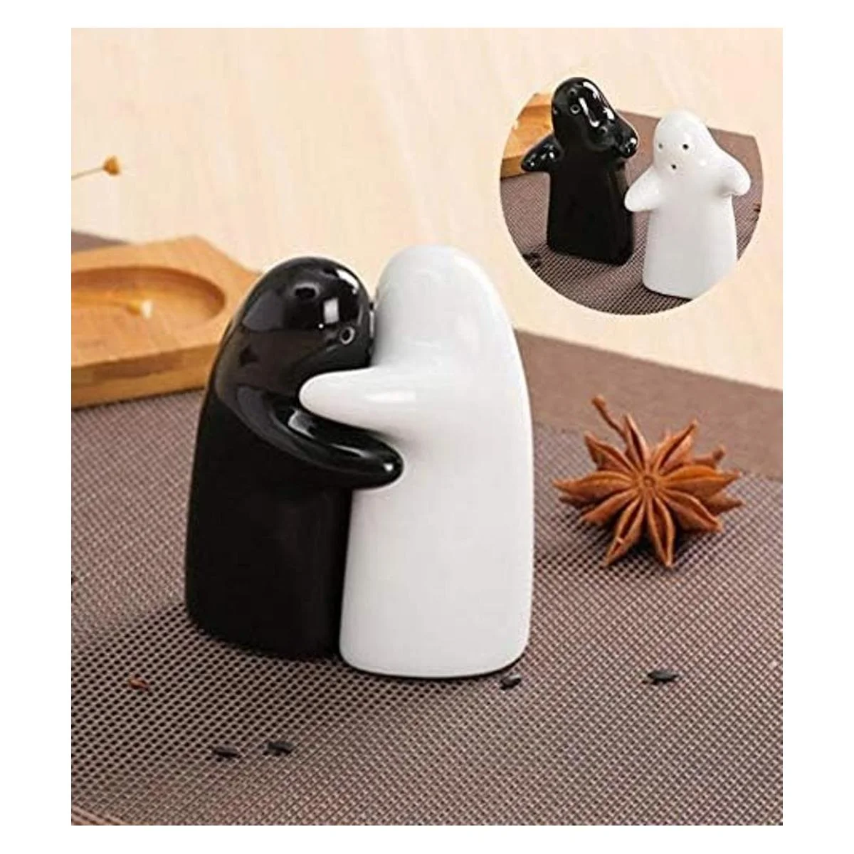 Juego de saleros y pimenteros para parejas con bonito diseño decorativo para abrazar, color blanco y negro, moderno y vintage, fácil de rellenar y dispensar temporada y especias, perfecto para regalo, Halloween