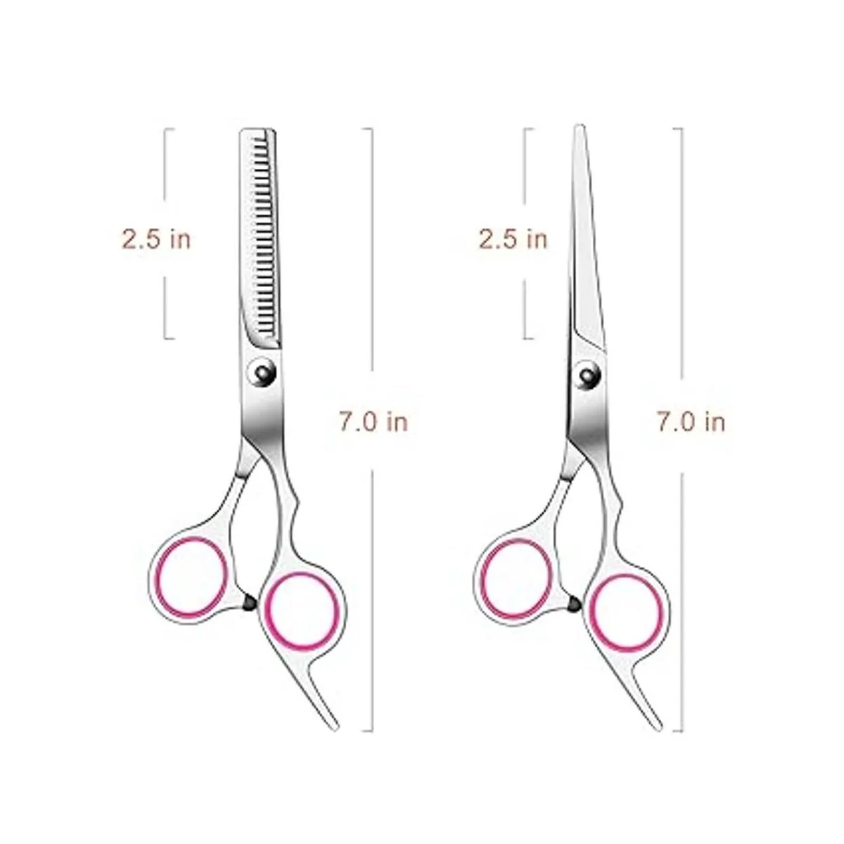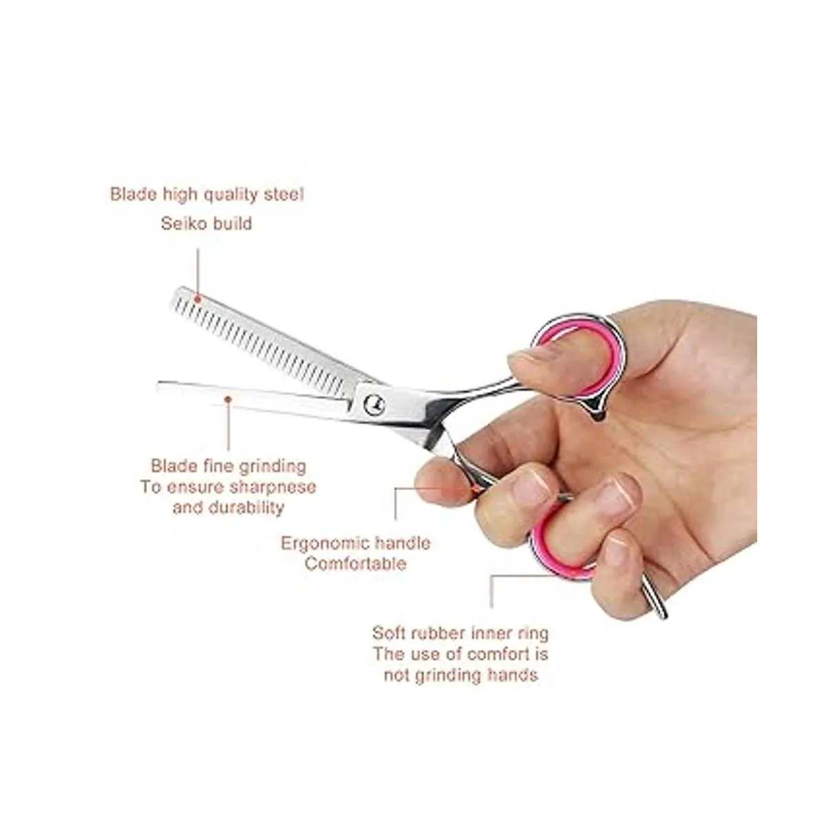 Diseño humanizado: El tornillo de tensión y ajuste de plata puede apretar o aflojar fácilmente las tijeras. El dedo de goma suave reduce la fricción para liberar el dolor.