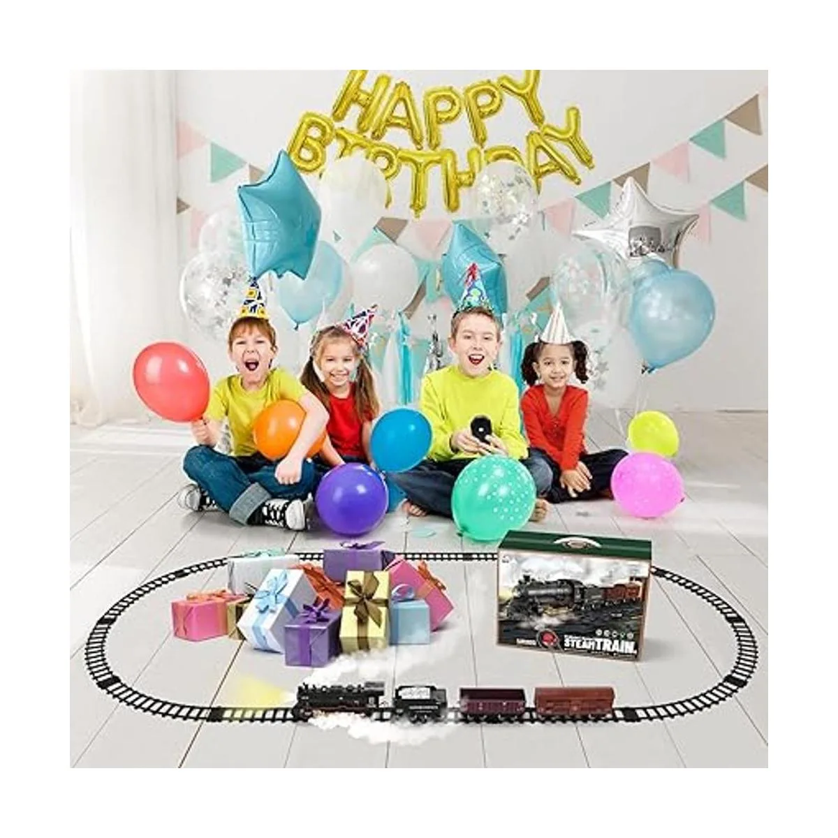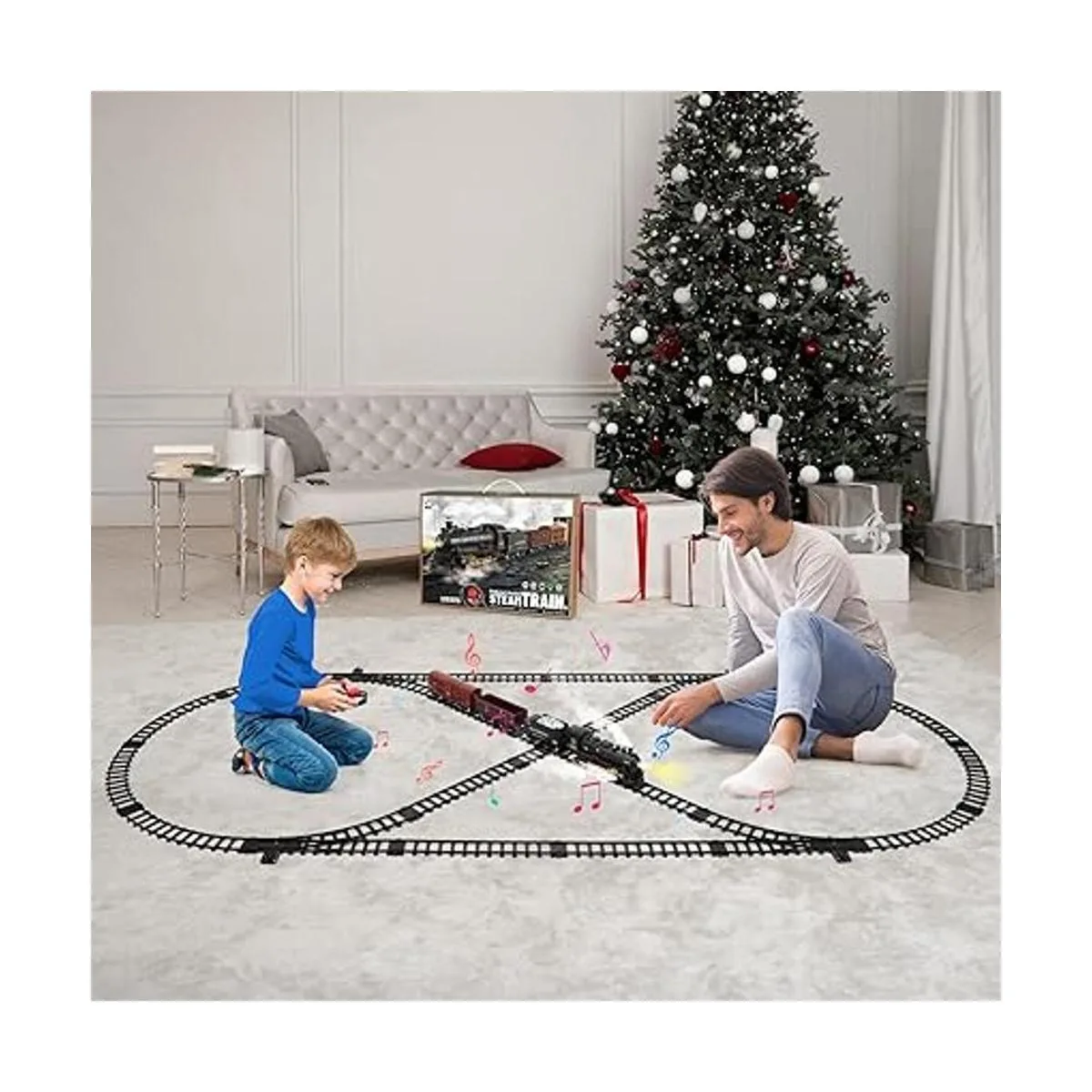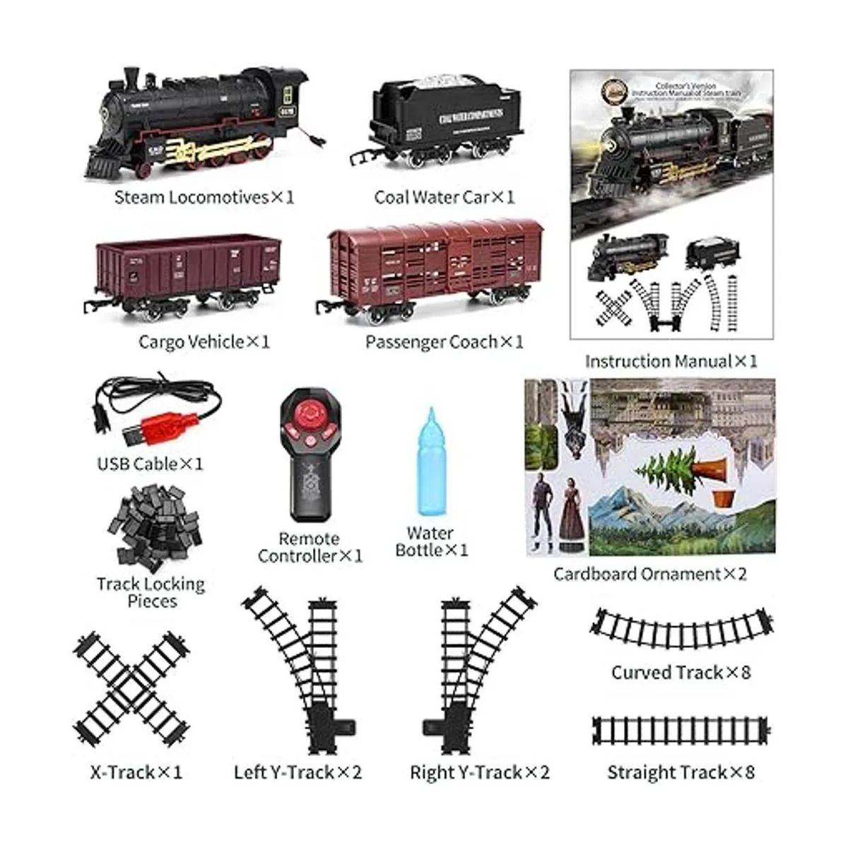 Juego de tren de motor de locomotora de vapor: los kits de tren eléctrico son de lujo, incluye tren de motor de vapor de aleación, control remoto de 2.4 GHz, coche de pasajeros, coche de carbón, vehículo de carga, 21 pistas, botella de agua, cable USB y otros accesorios de escena. El equipo mejorado enriquece tu experiencia de juego.