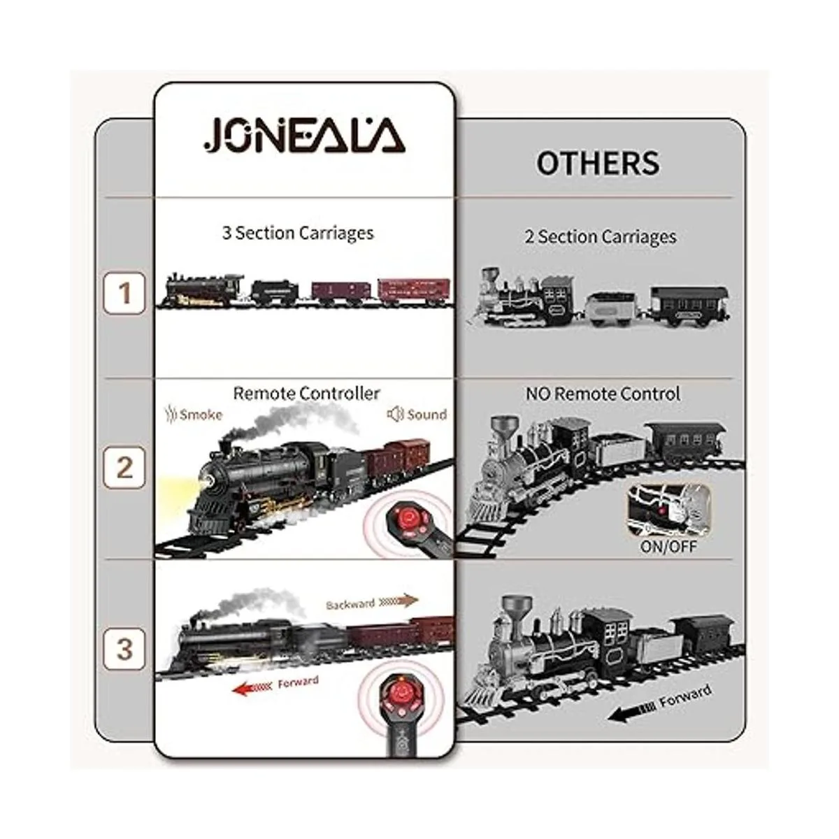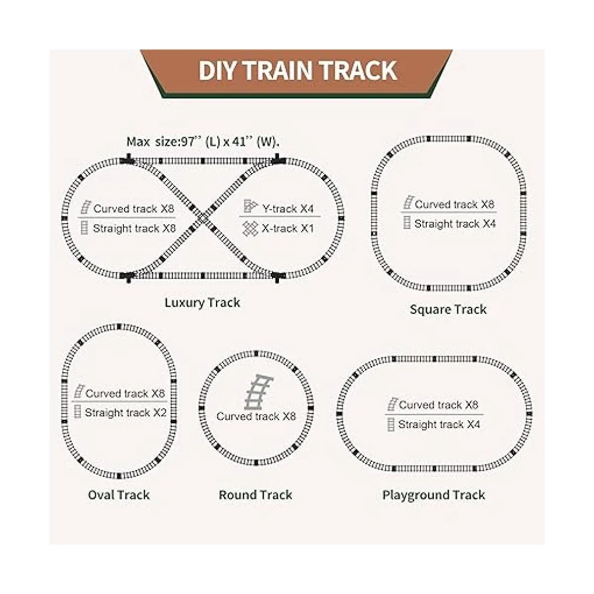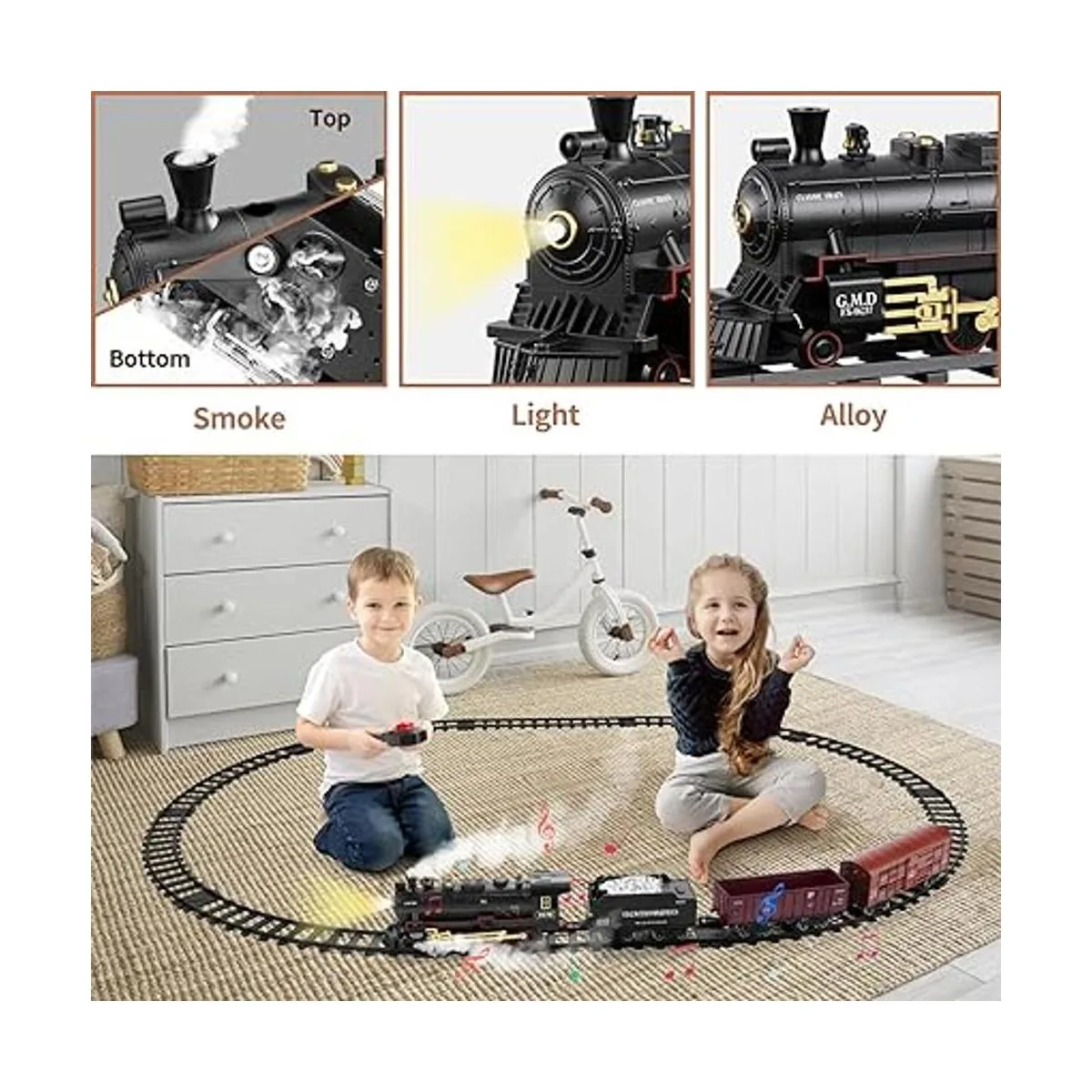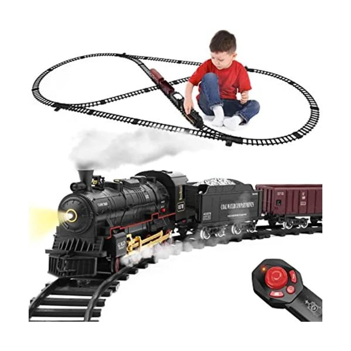 Control remoto y tren de modelo eléctrico: el juego de ferrocarril de tren viene con un control remoto, que cuenta con interruptor de arranque de trompeta/atomización, retroceso/avance y ajuste de velocidad, estas funciones proporcionan el entretenimiento más conveniente e interesante para los niños.