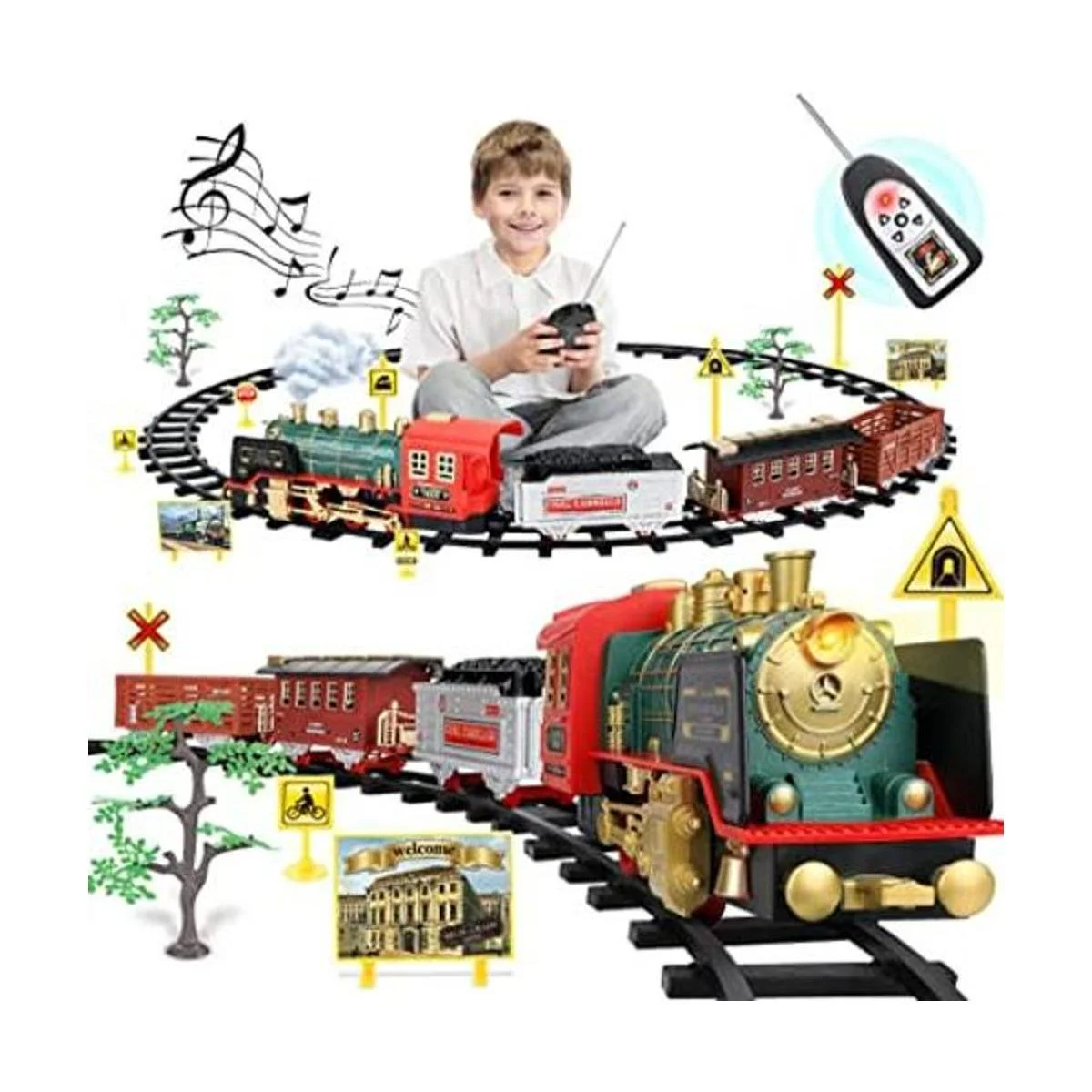 Juego de tren eléctrico con control remoto: en comparación con otros juguetes de tren electrónico, nuestro juego de tren RC no solo incluye los motores de locomotora, coches de carbón, coche de pasajeros, coche de carga, pistas rectas, pistas curvas, señales de tráfico, árboles, botella de agua vacía, sino que también está equipado con control remoto, baterías recargables y cables USB. Los niños pueden controlar el tren para detener, adelante, acelerar o hacia atrás. Además, puede encender y apagar el sonido a través del control remoto cuando está funcionando.