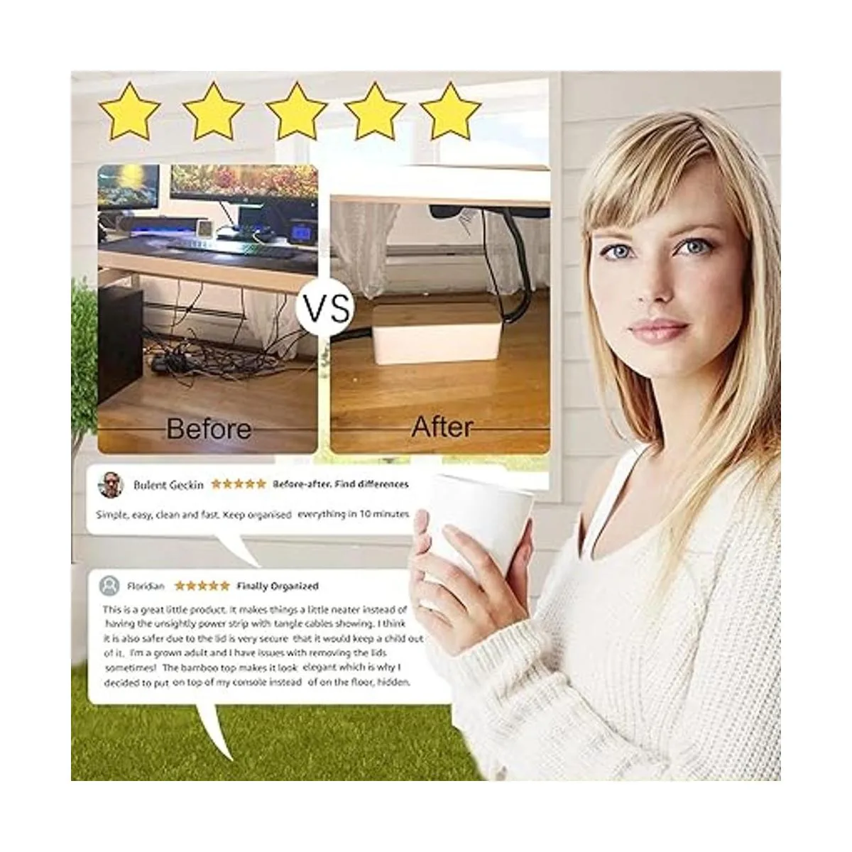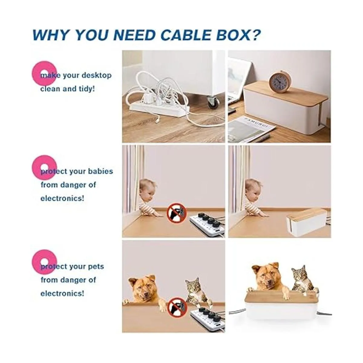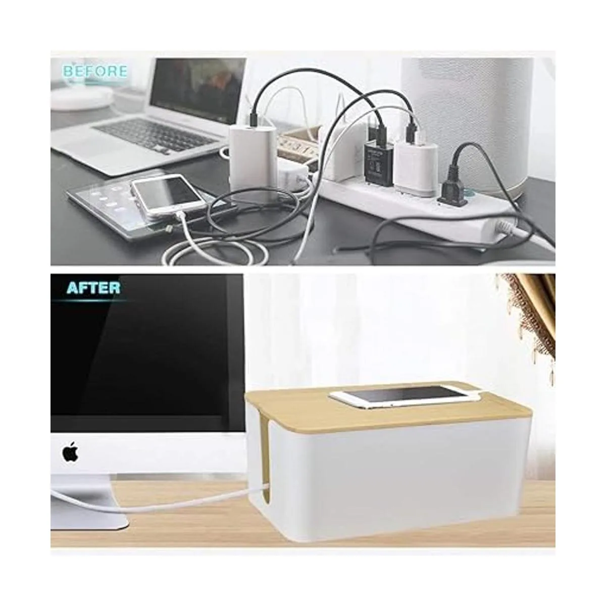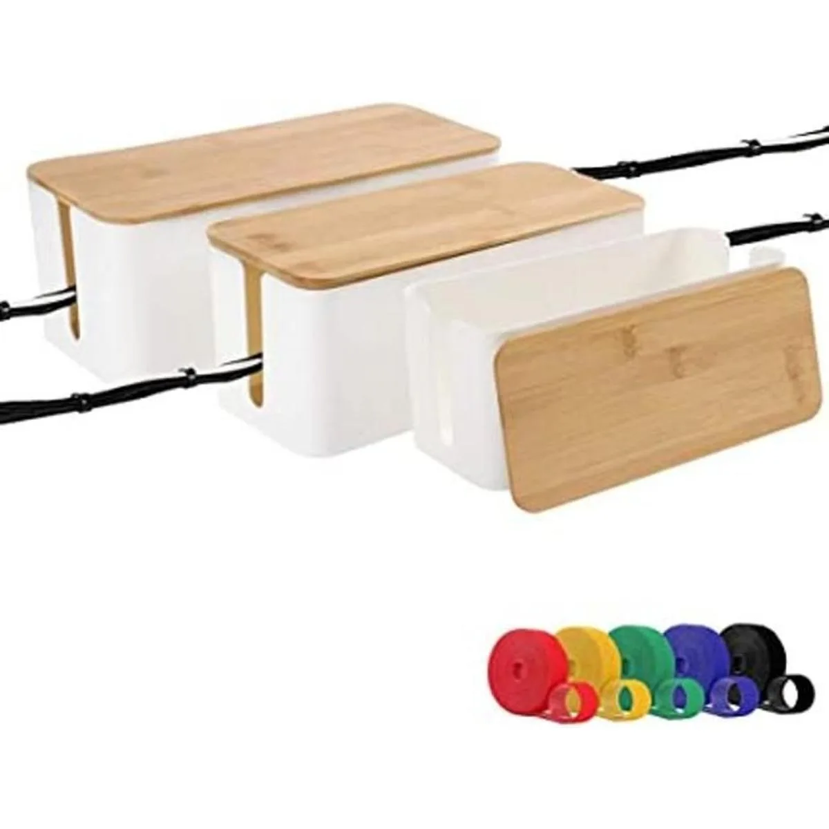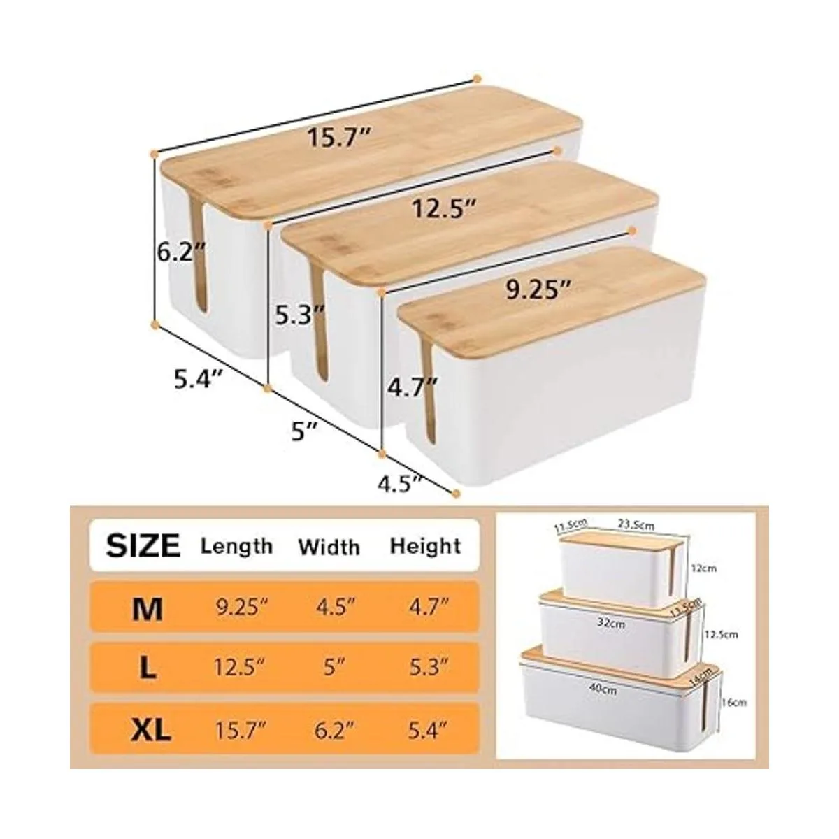 Juego de tres Organizador de caja de gestión de cables, tapa de bambú, soporte grande para cables de almacenamiento para el hogar, escritorio, cocina, TV, computadora, ideal para cubrir el protector de sobretensiones ordenado, tiras de alimentación y cables blanco